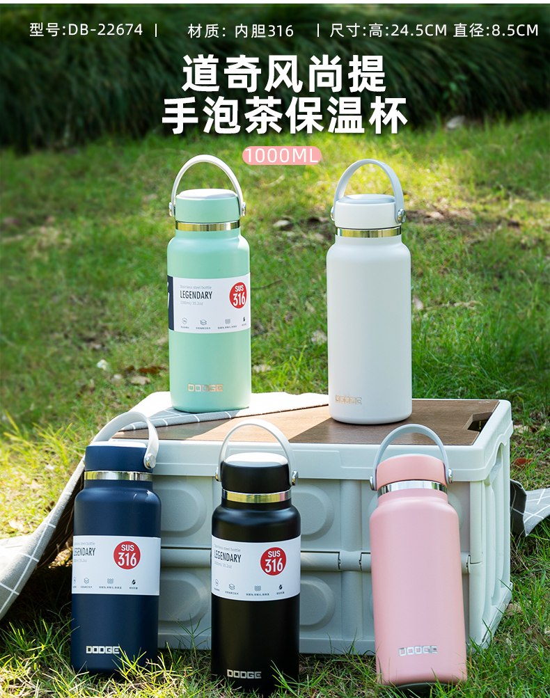 1000ML道奇徒步双饮保温壶316不锈钢大容量保温杯