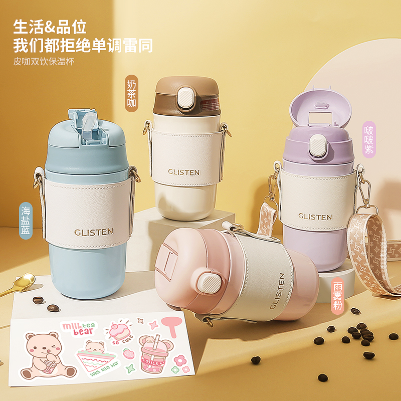 480ML皮咖双饮保温杯304不锈钢男女士商务办公咖啡杯