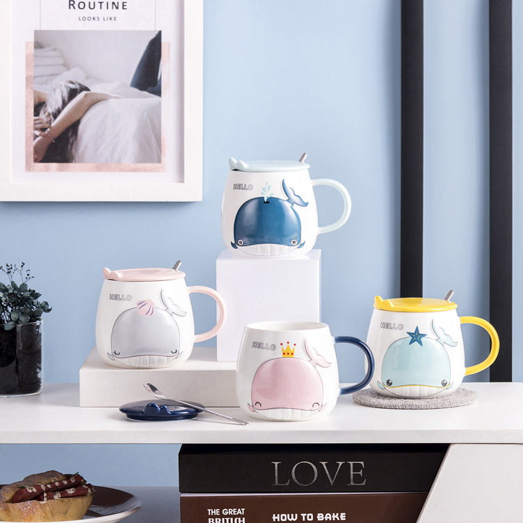 卡通浮雕鲨鱼陶瓷杯带盖办公杯情侣杯家用马克杯咖啡杯水杯带盖勺