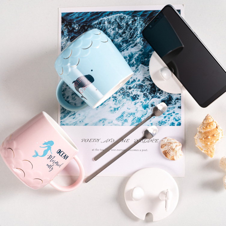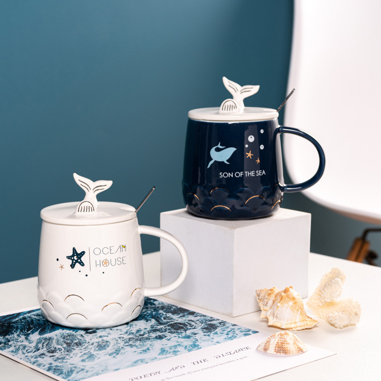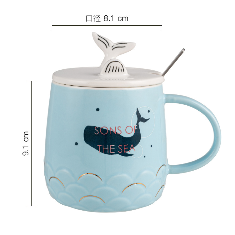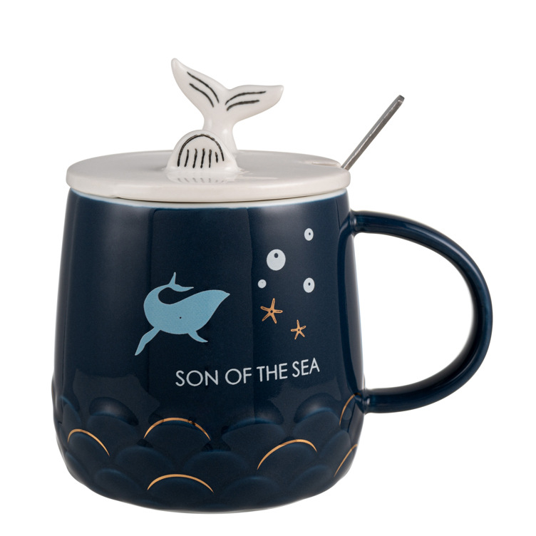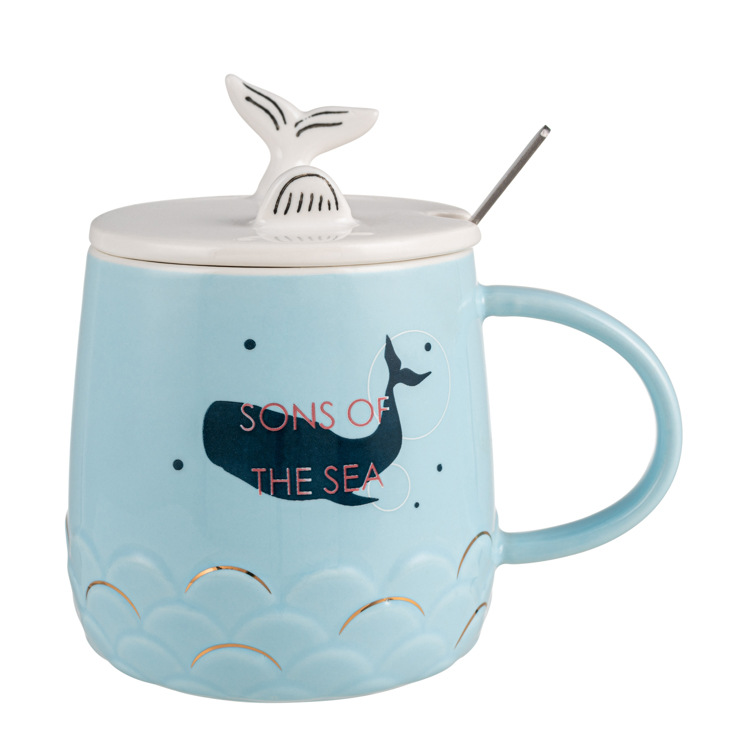 卡通浮雕鲨鱼陶瓷杯带盖办公杯情侣杯家用马克杯咖啡杯水杯带盖勺