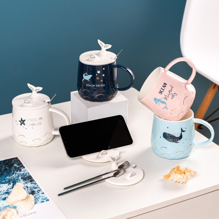 创意多功能马克杯卡通杯海洋风格陶瓷杯带盖勺家用办公室咖啡杯