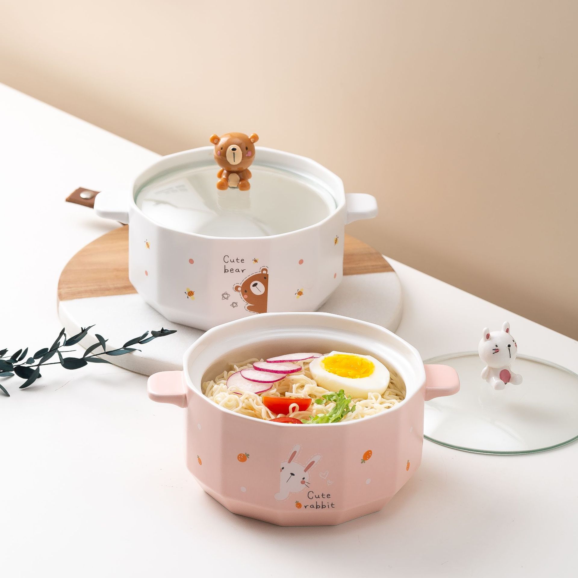 创意卡通双耳家用泡面碗超大容量玻璃盖子双耳汤碗礼品印LOGO