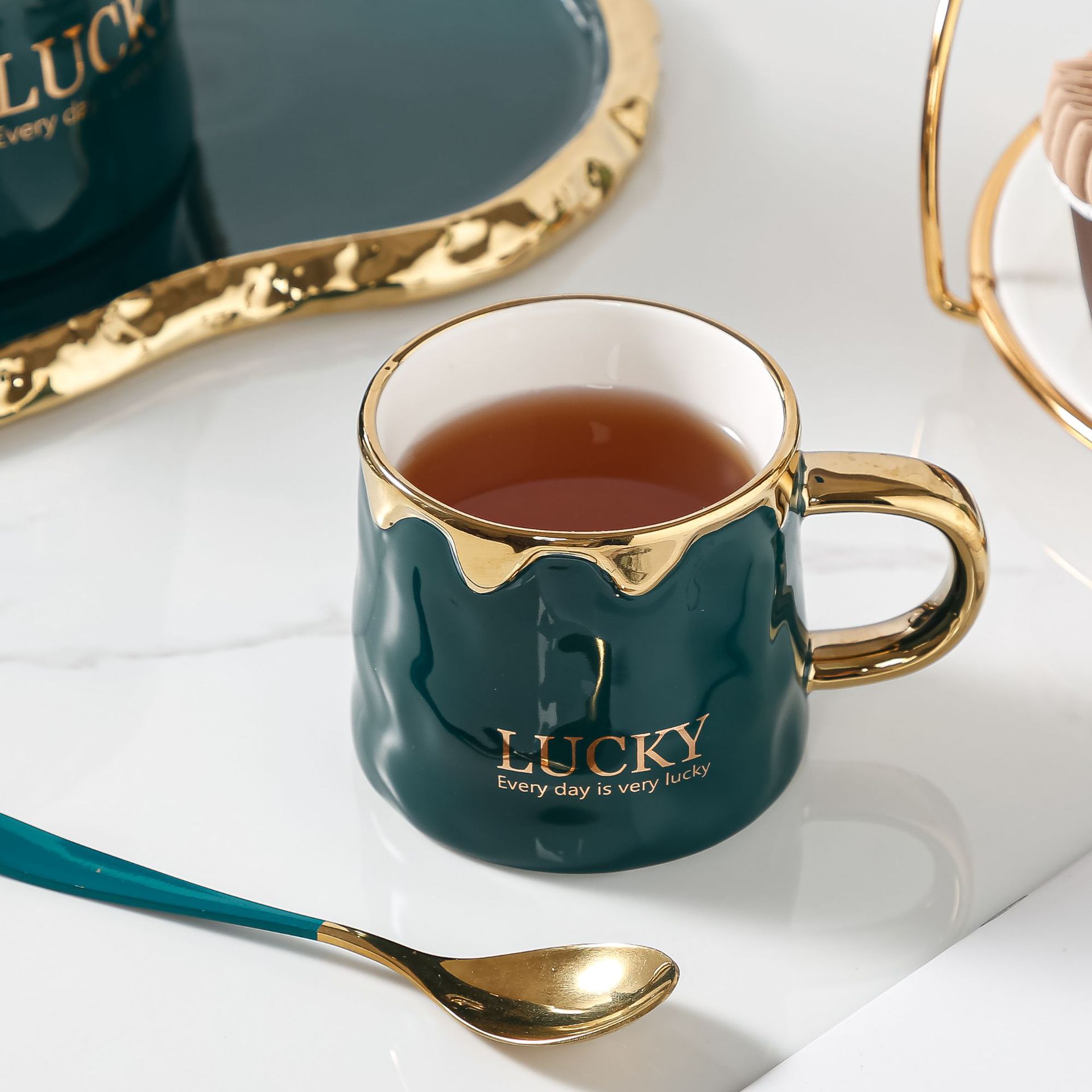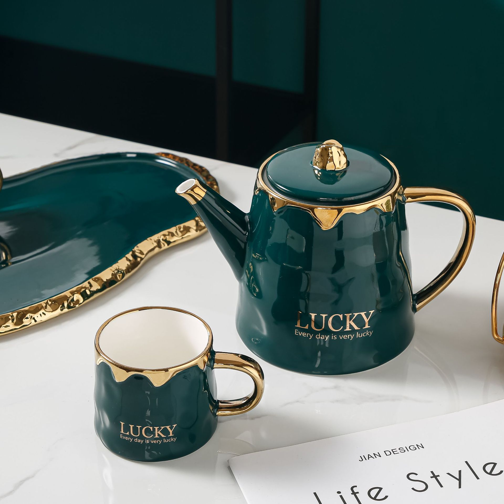 跨境陶瓷咖啡具套装墨绿描金陶瓷杯碟配金架商用礼品礼盒包装