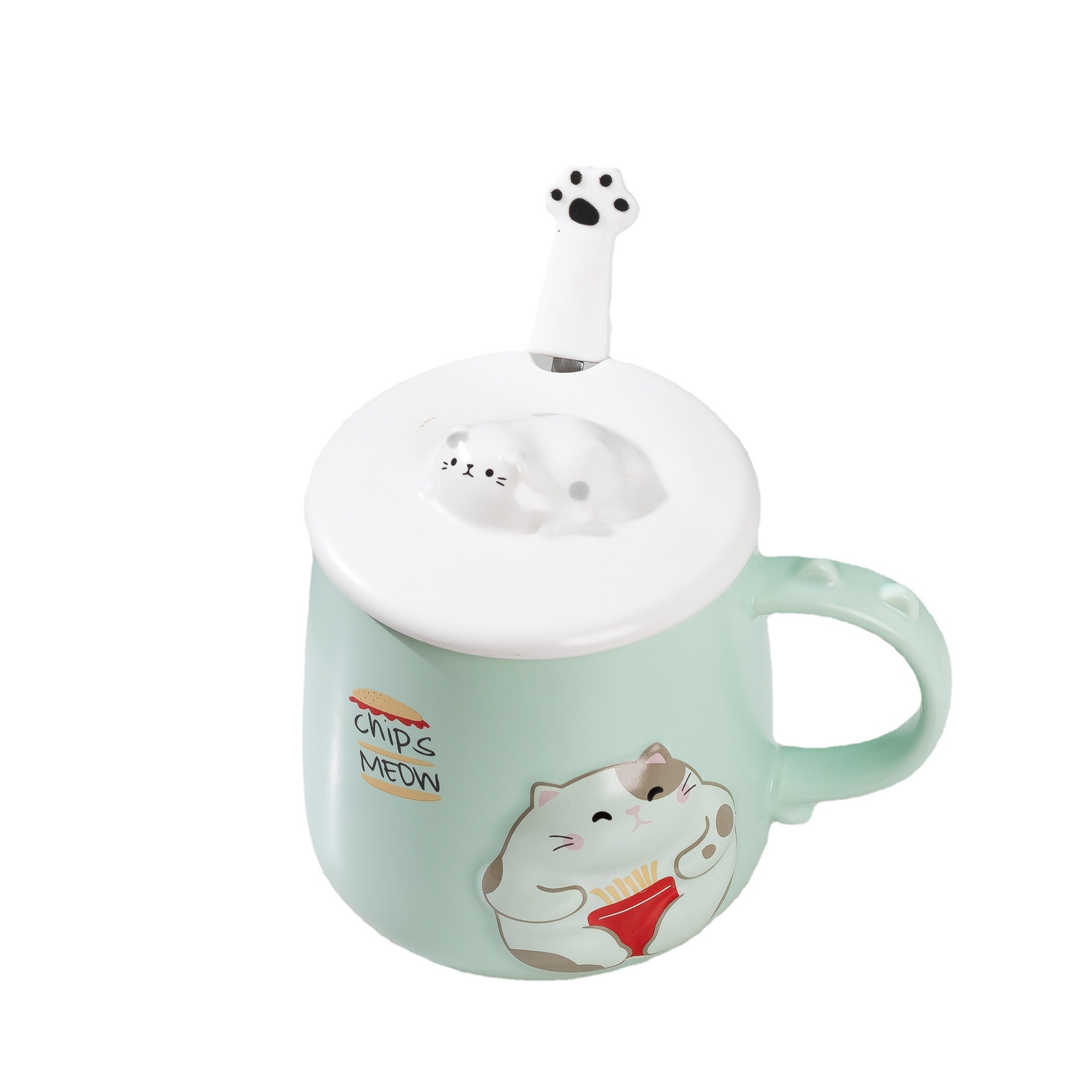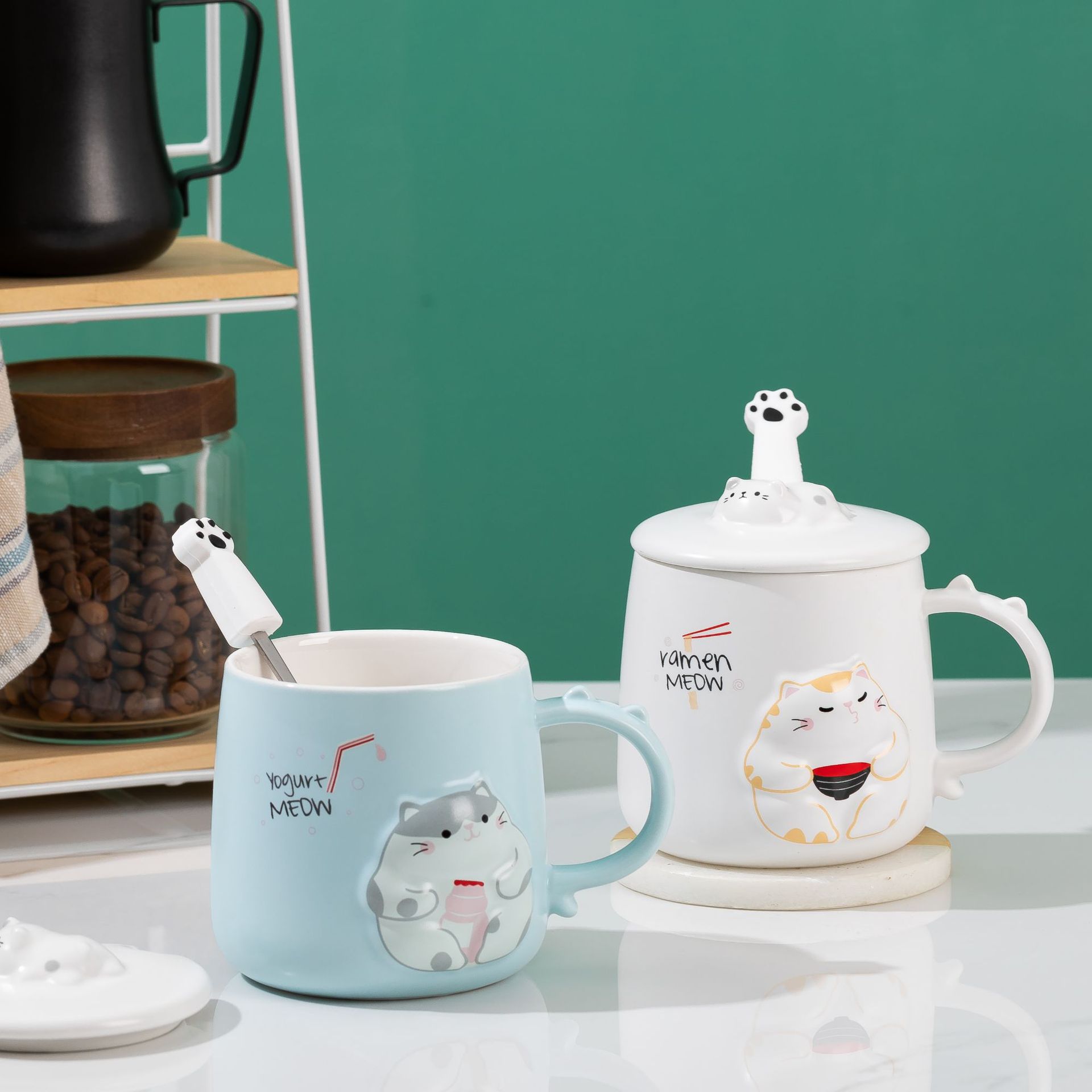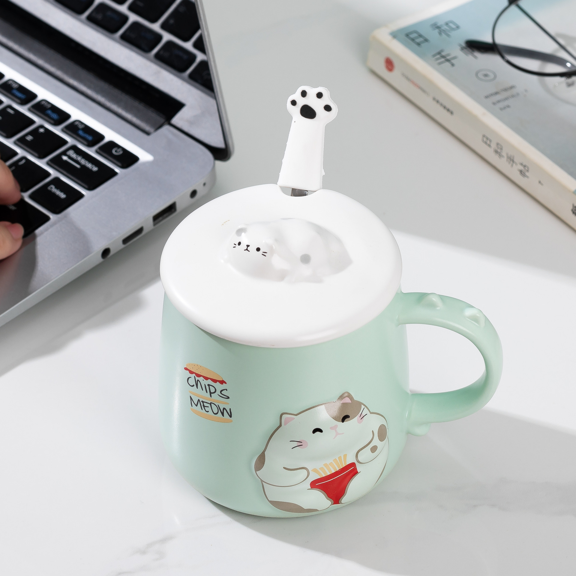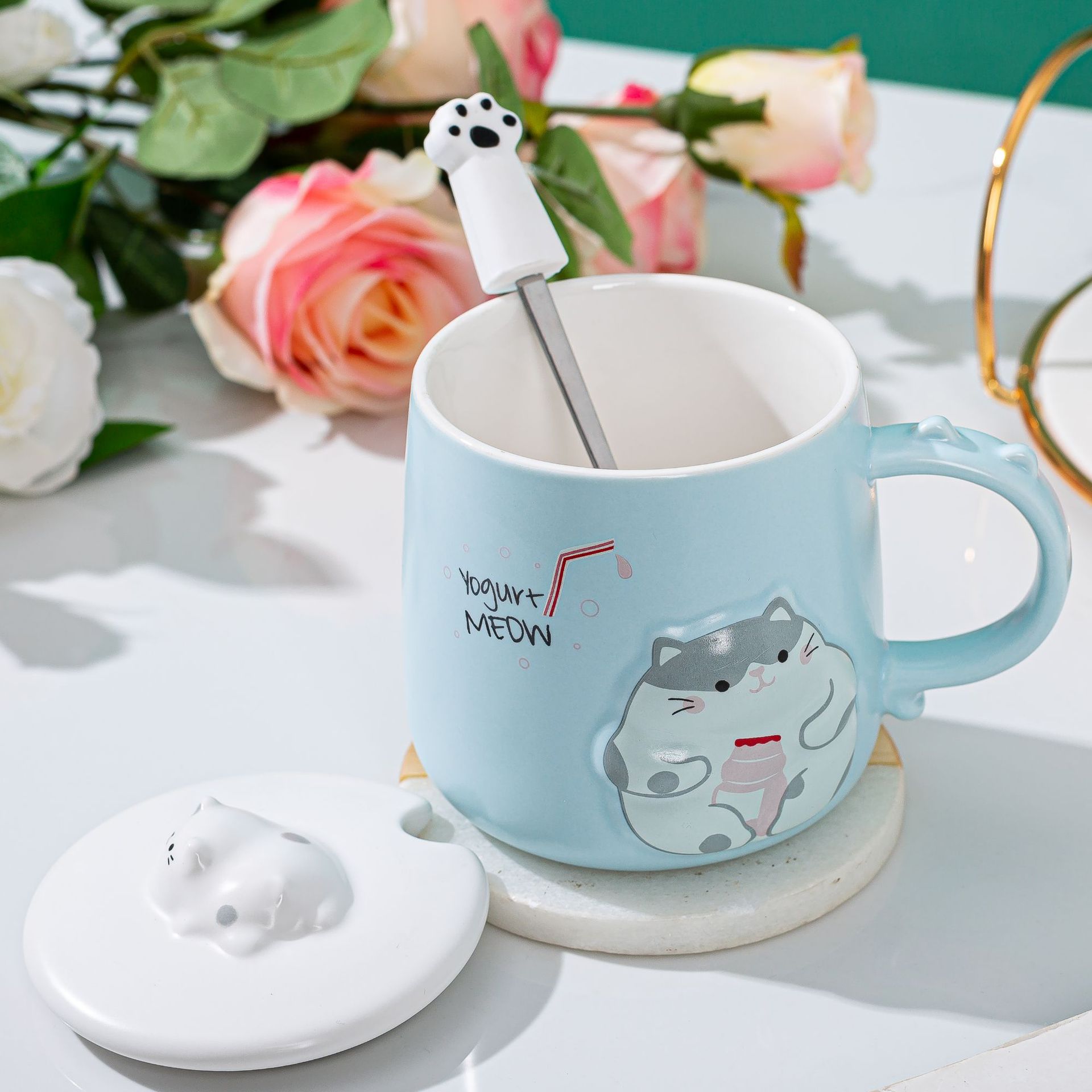 创意简约浮雕懒猫陶瓷杯办公室家用女生喝水带盖勺牛奶咖啡马克杯