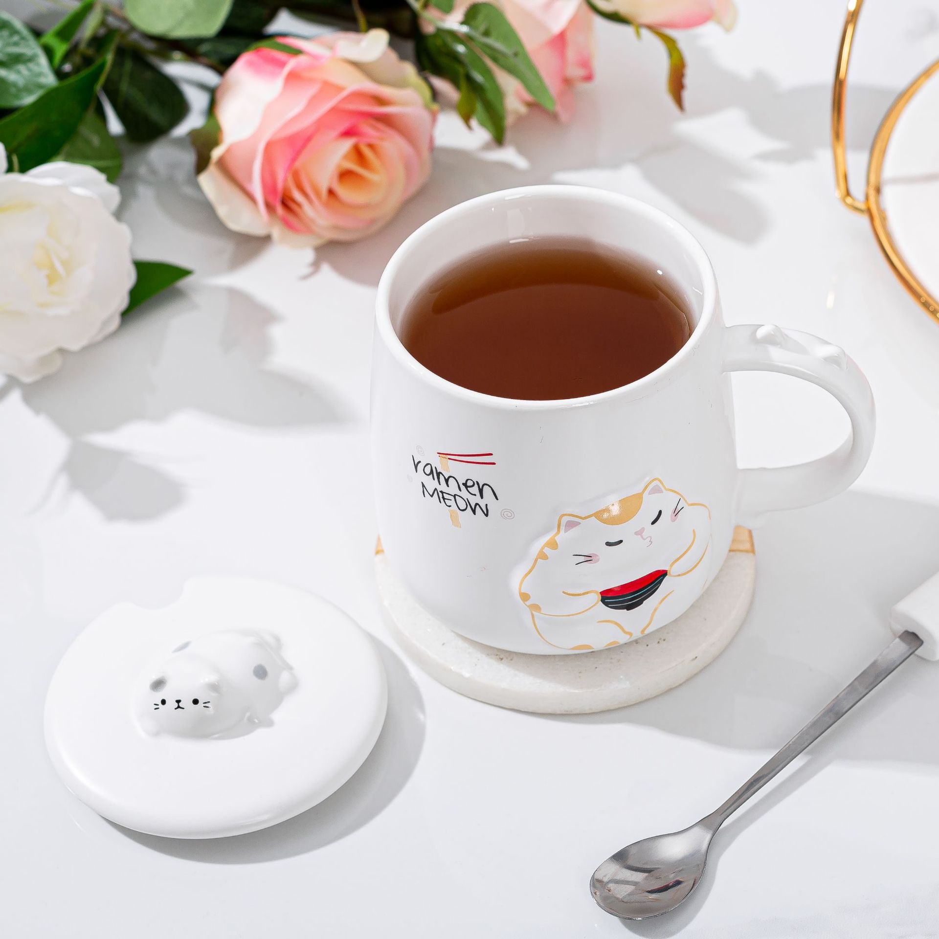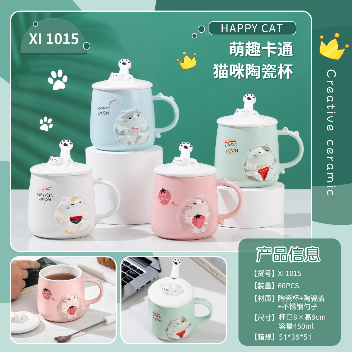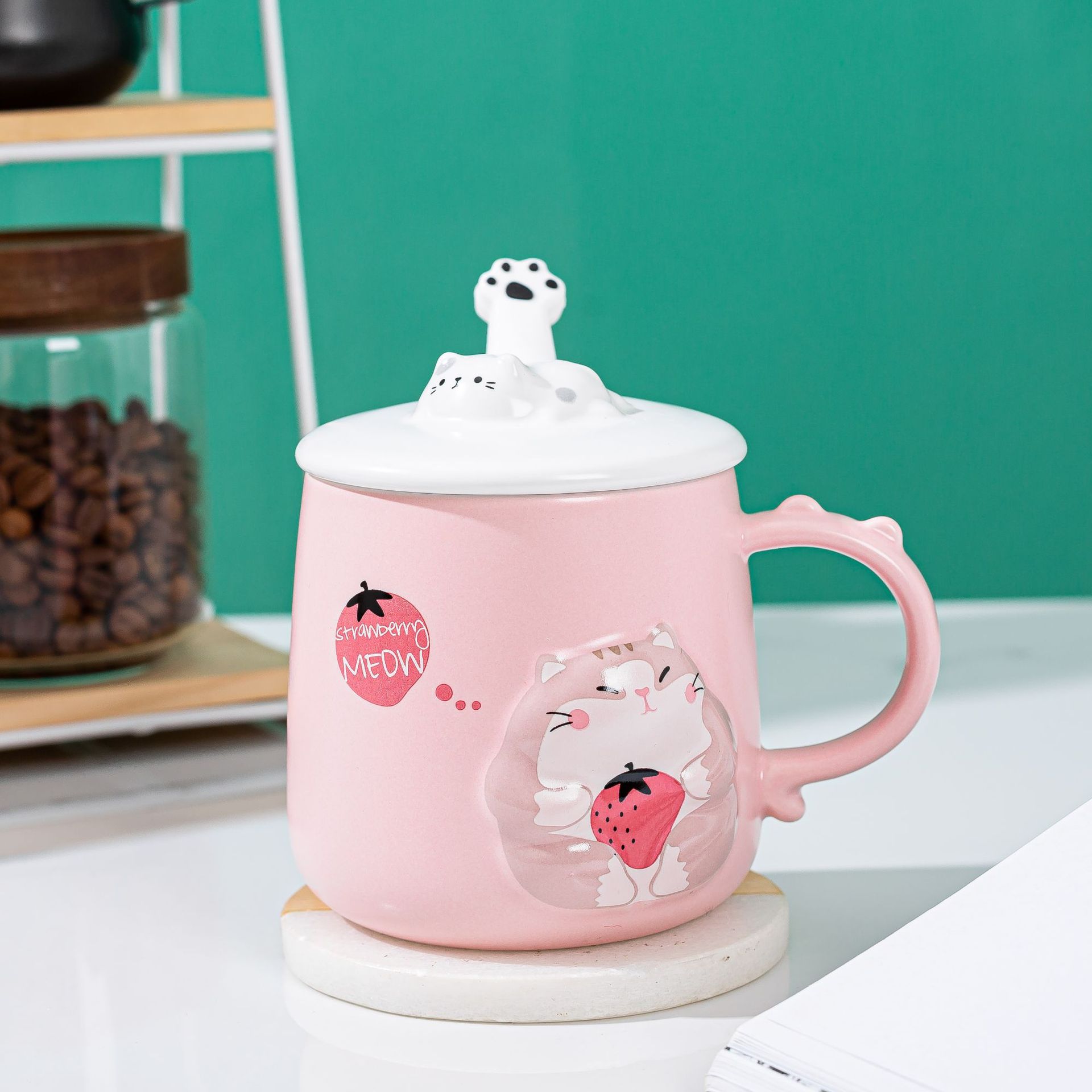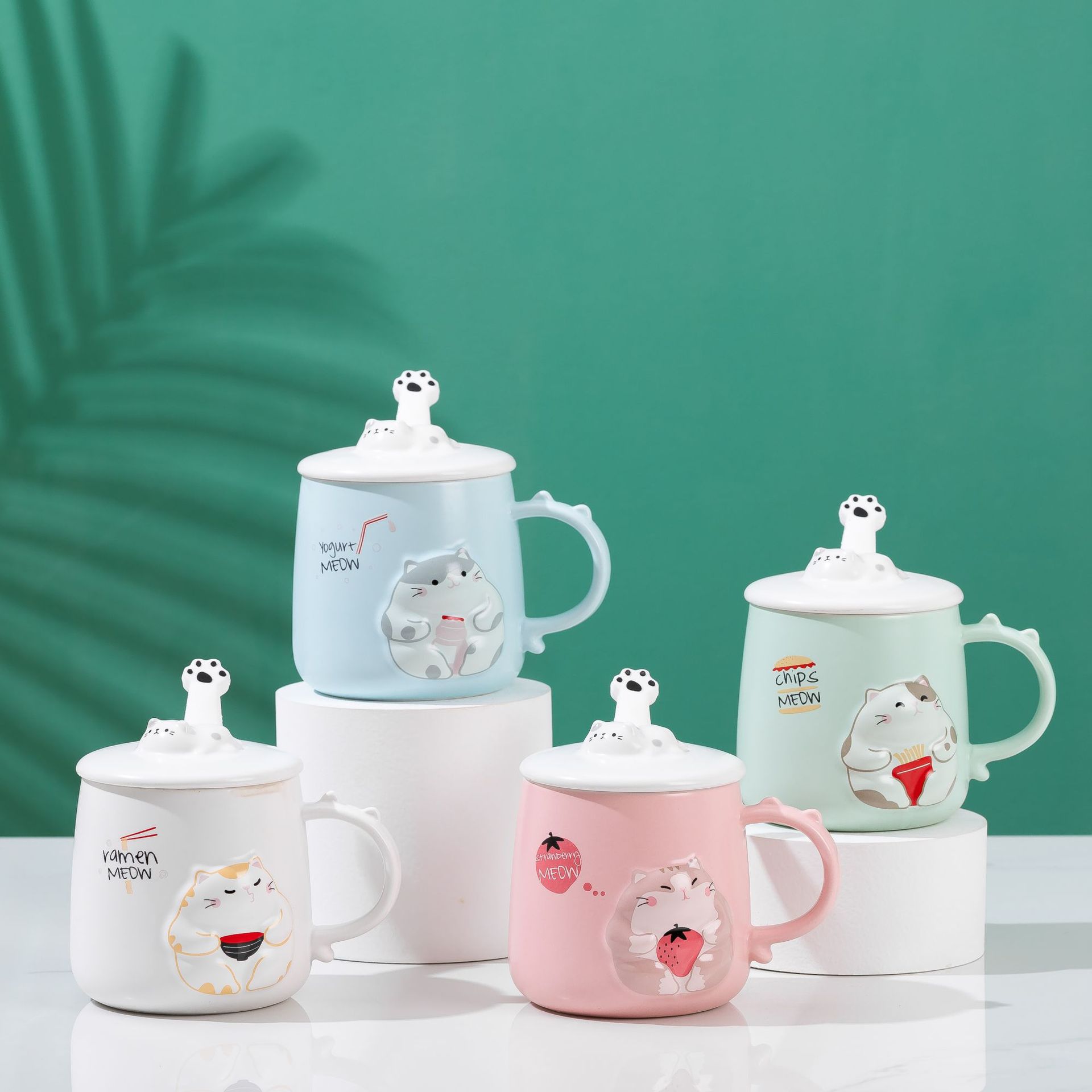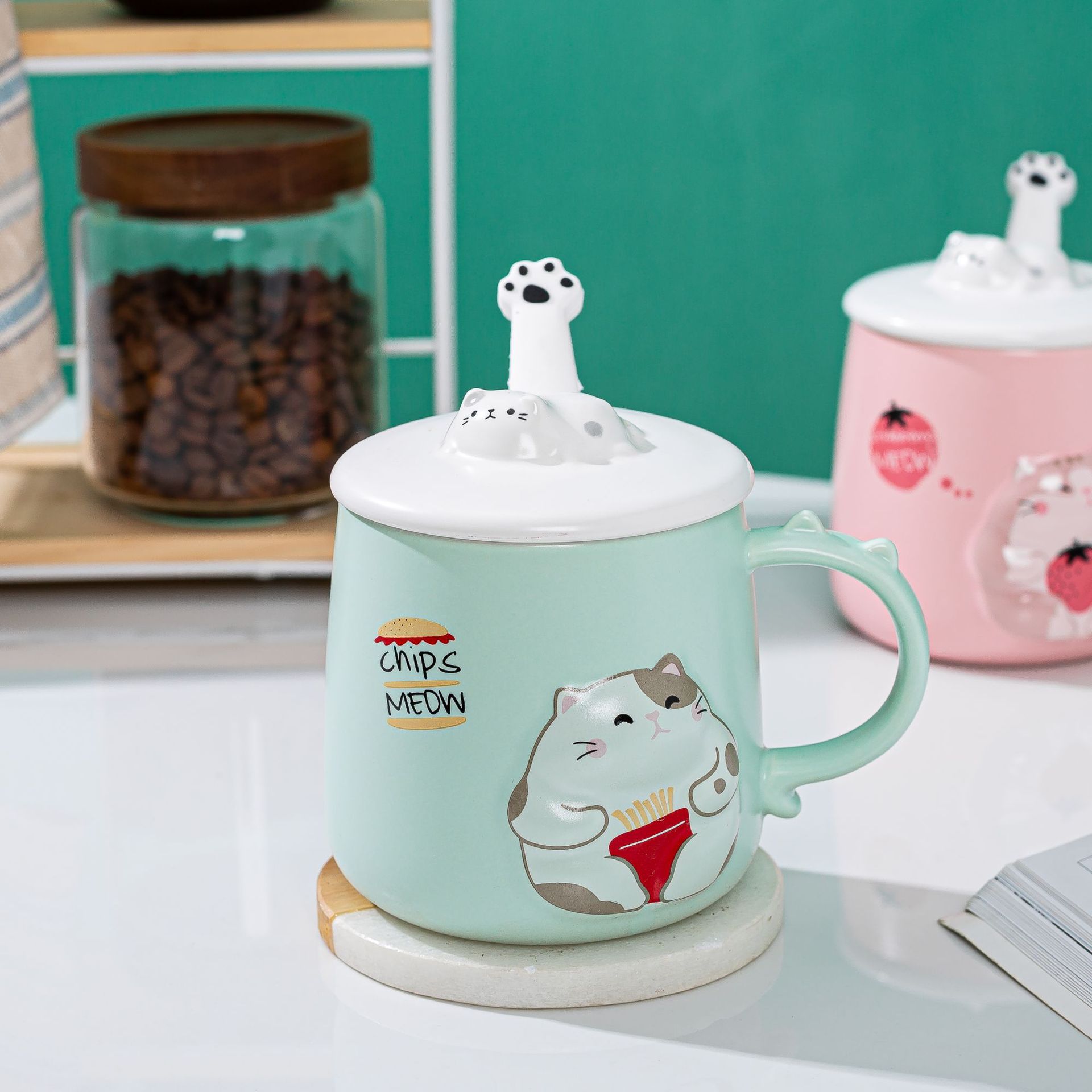 创意简约浮雕懒猫陶瓷杯办公室家用女生喝水带盖勺牛奶咖啡马克杯