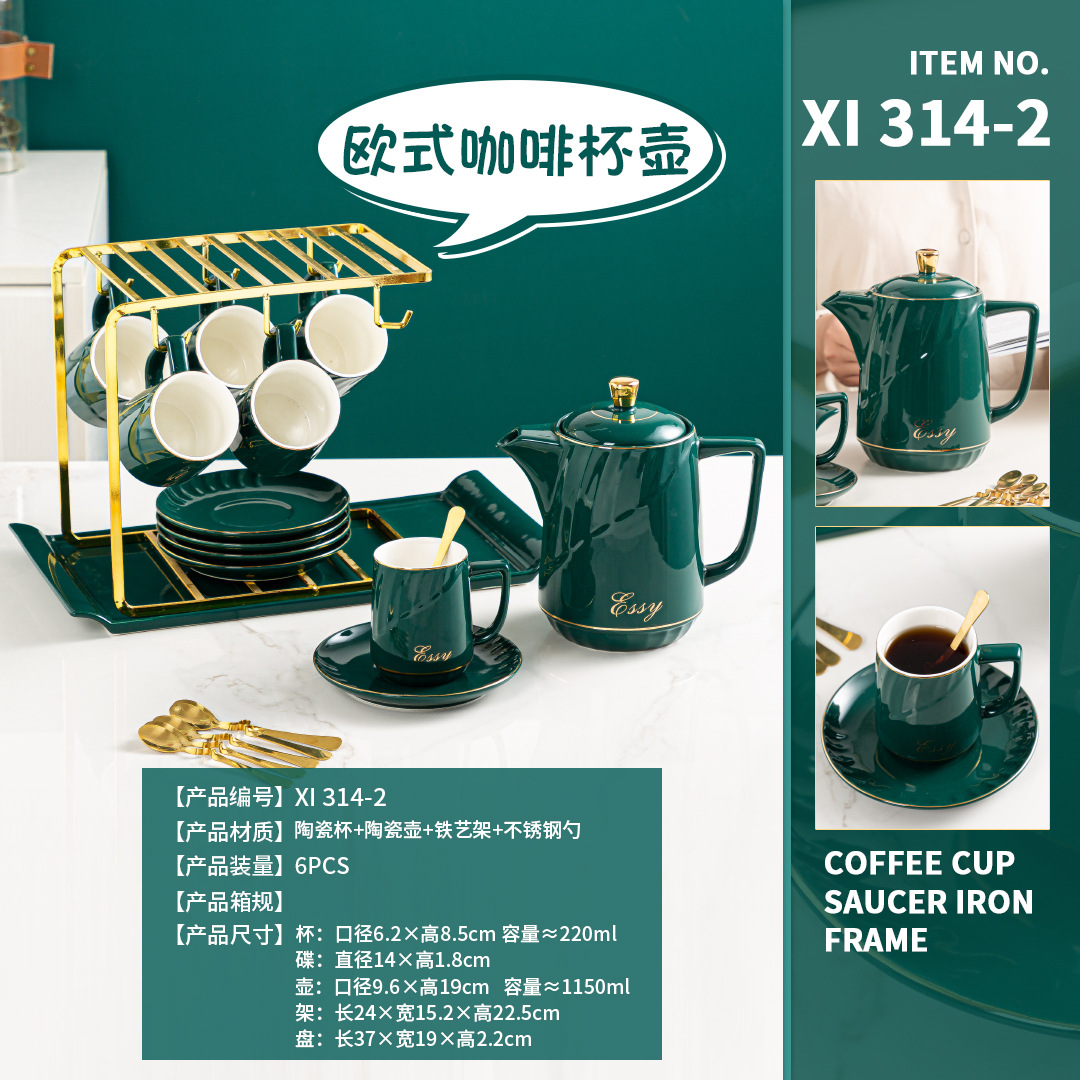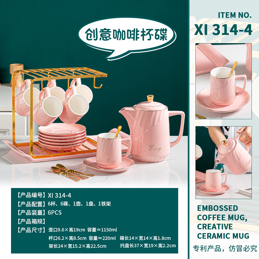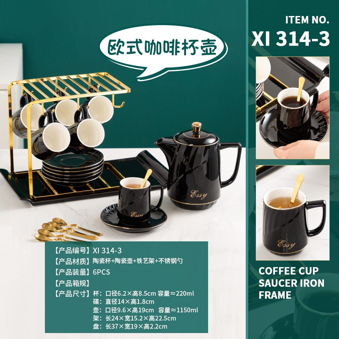 日用跨境货源陶瓷办公室酒店派对咖啡杯具6杯带水壶咖啡水具套装