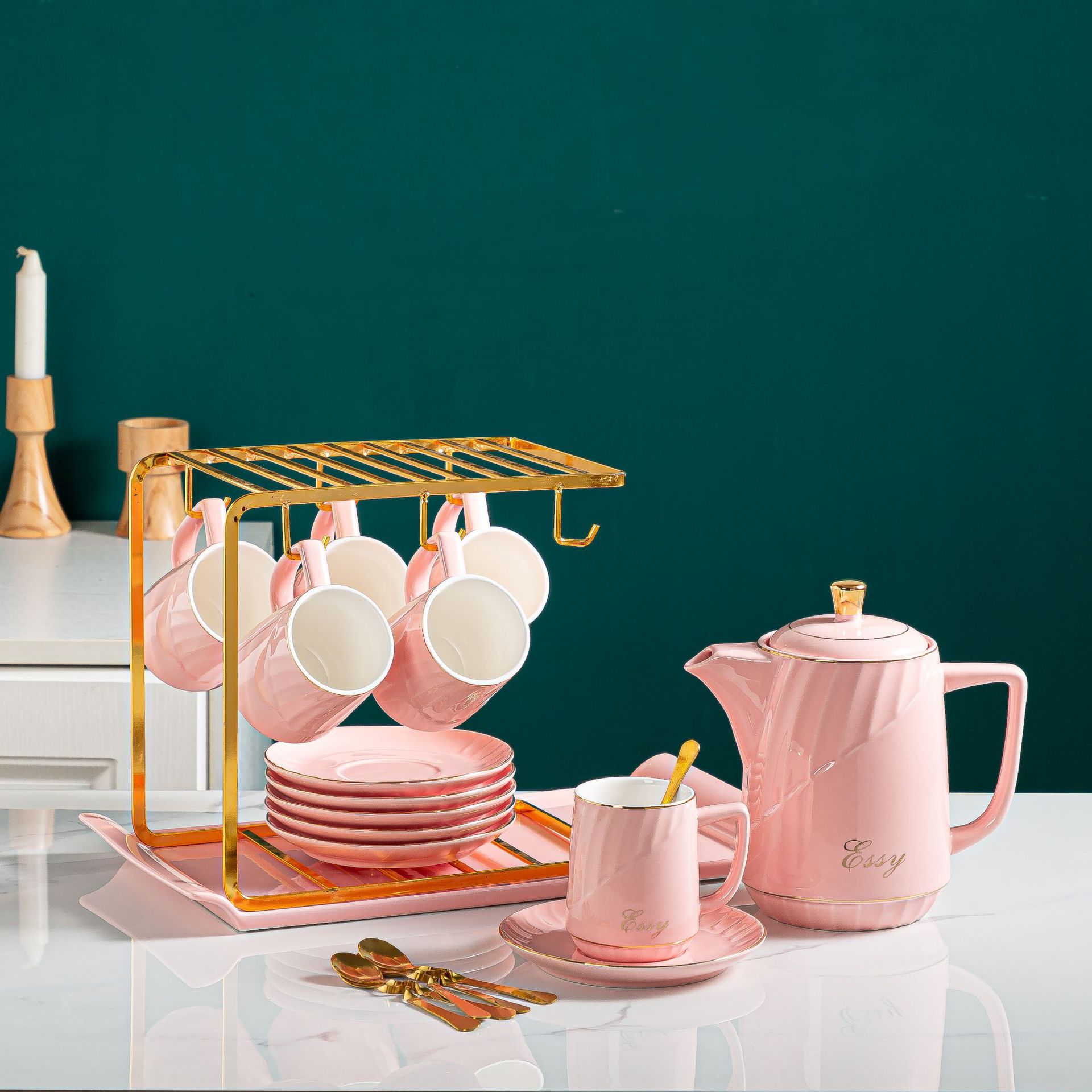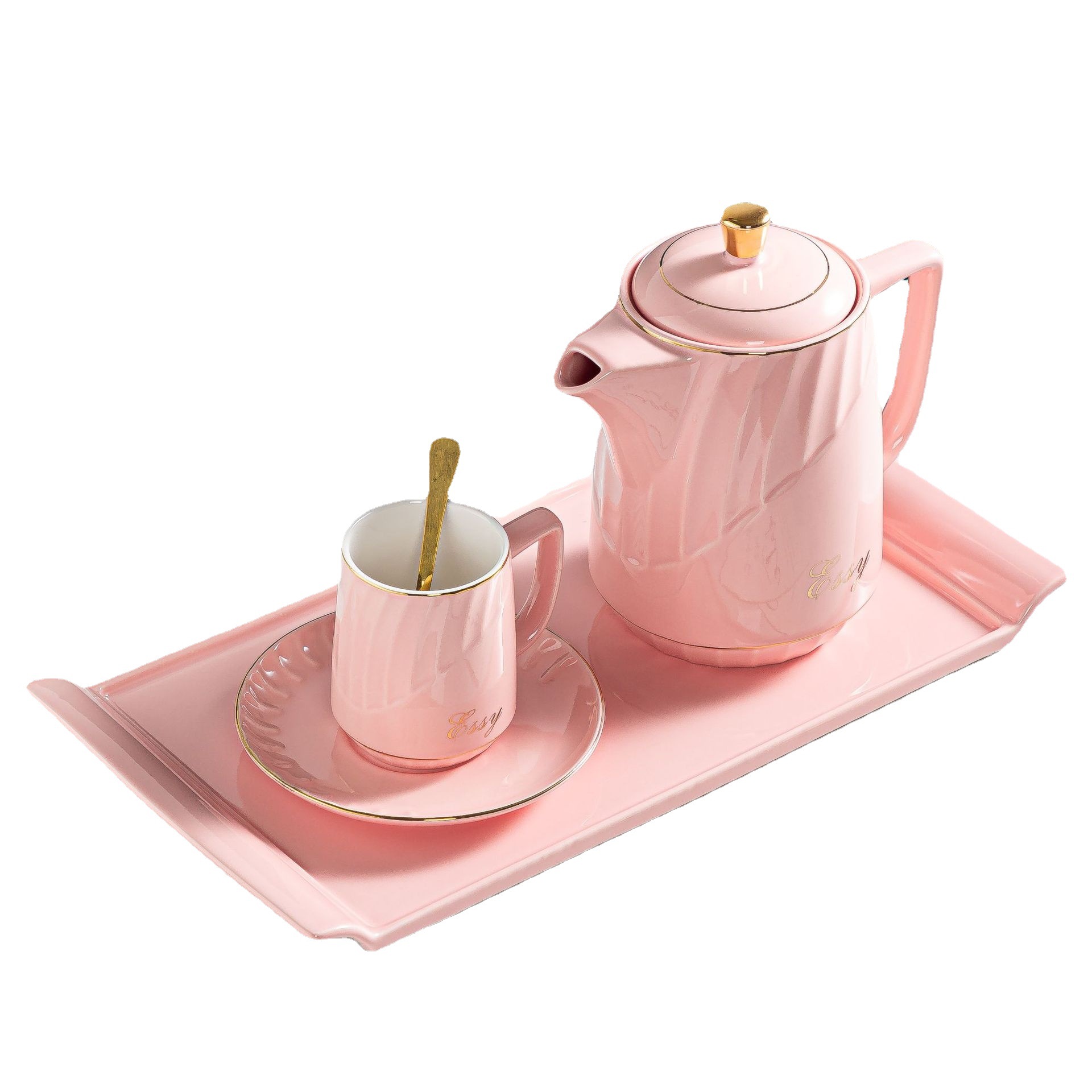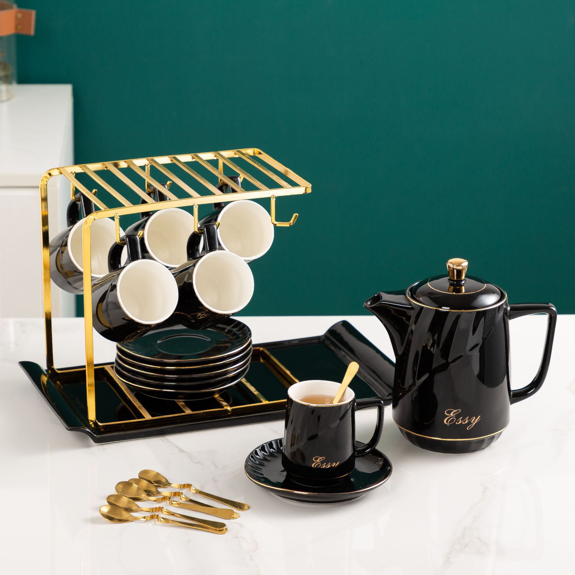 欧式轻奢陶瓷水具ins不规则创意电镀水具厂家直销1壶6杯带盘