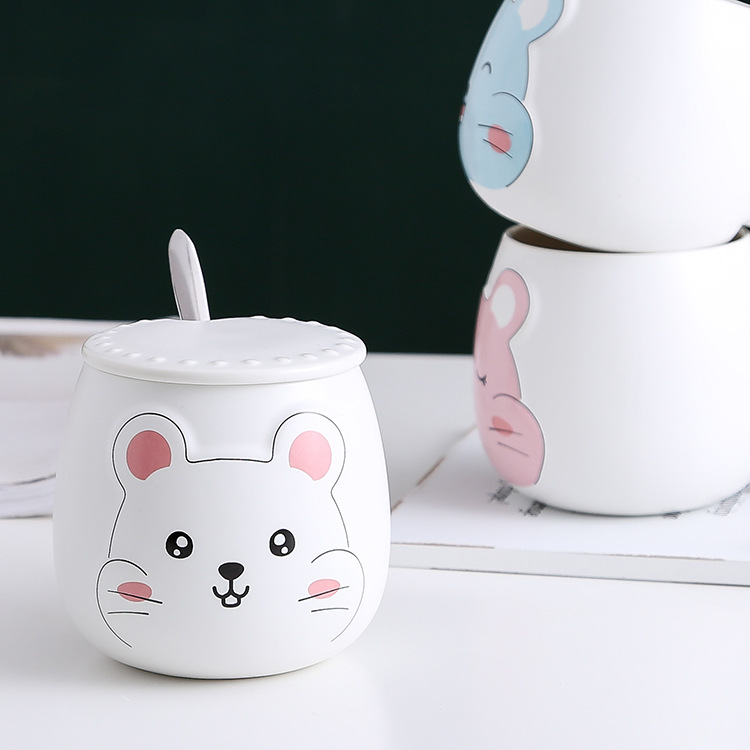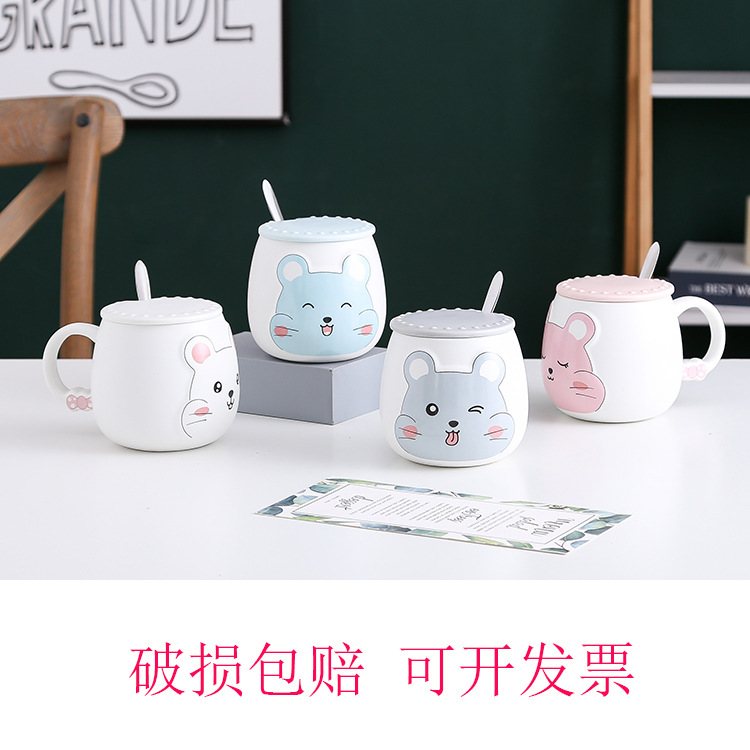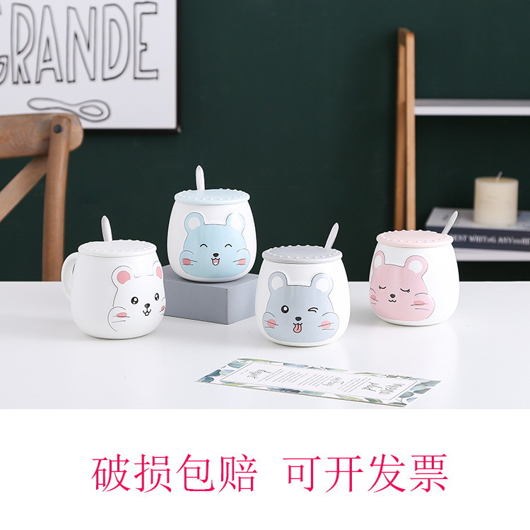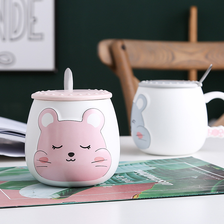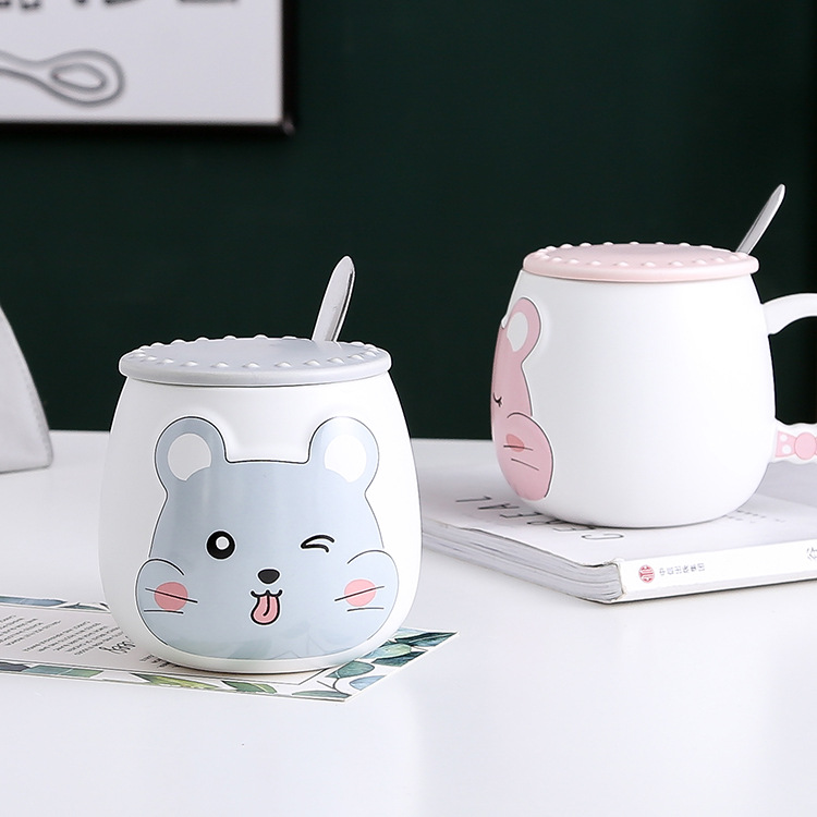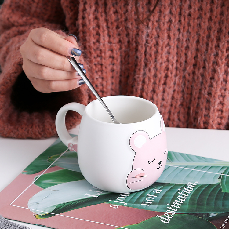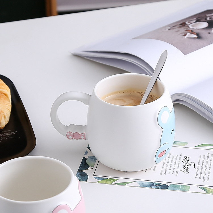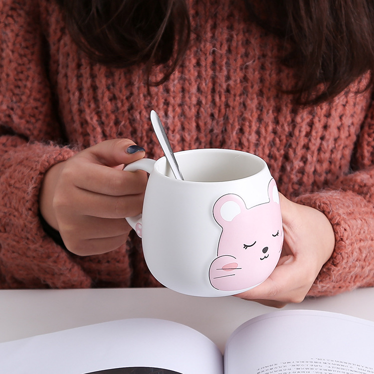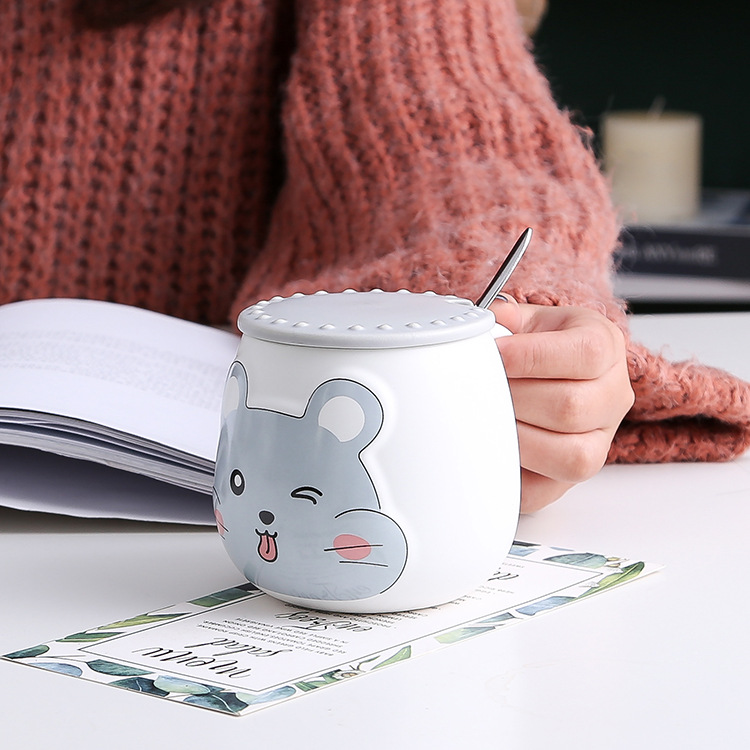 卡通创意动物陶瓷杯可爱家用简约带盖勺牛奶咖啡杯马克杯可加logo