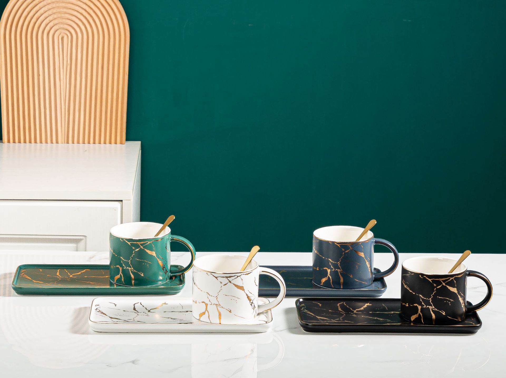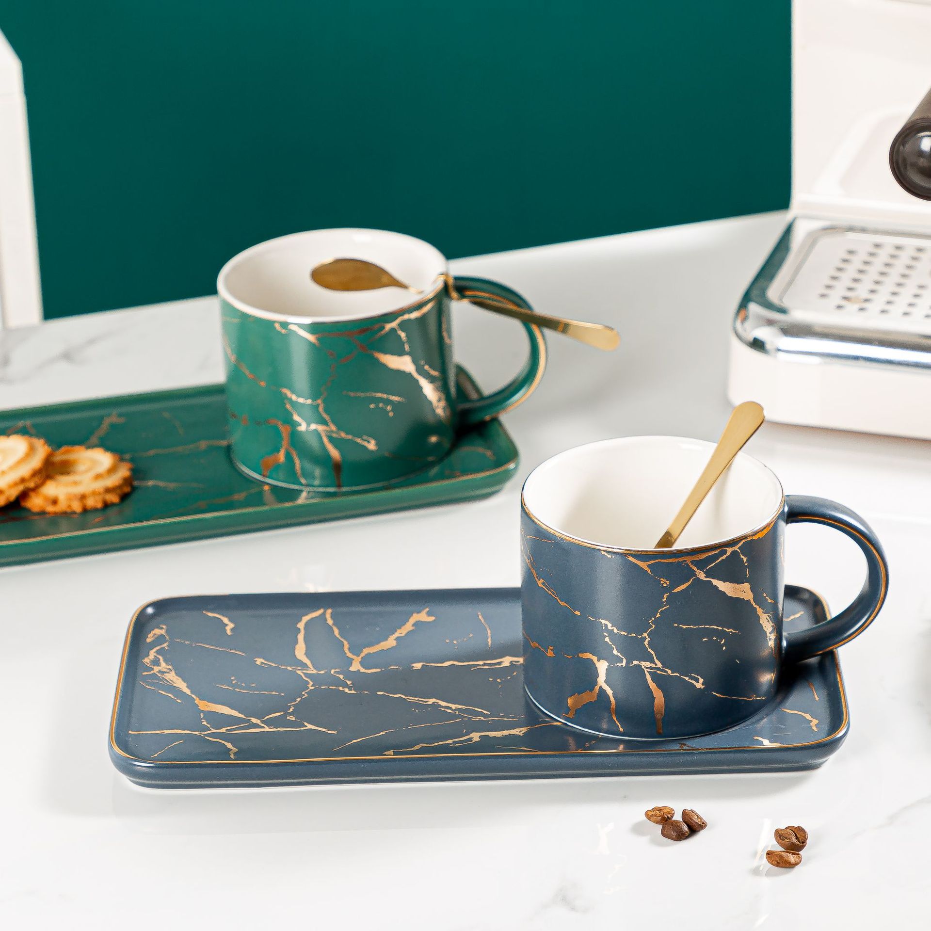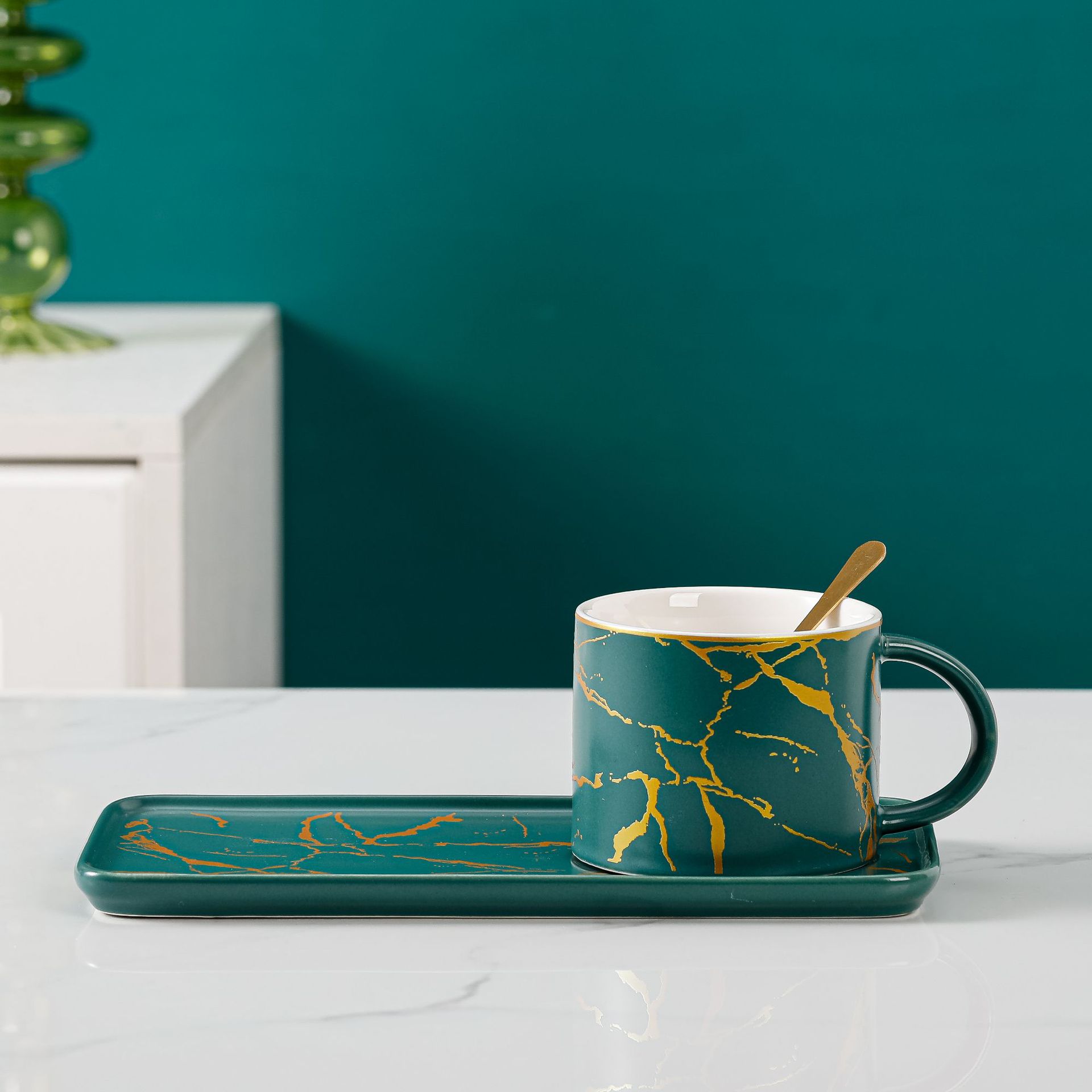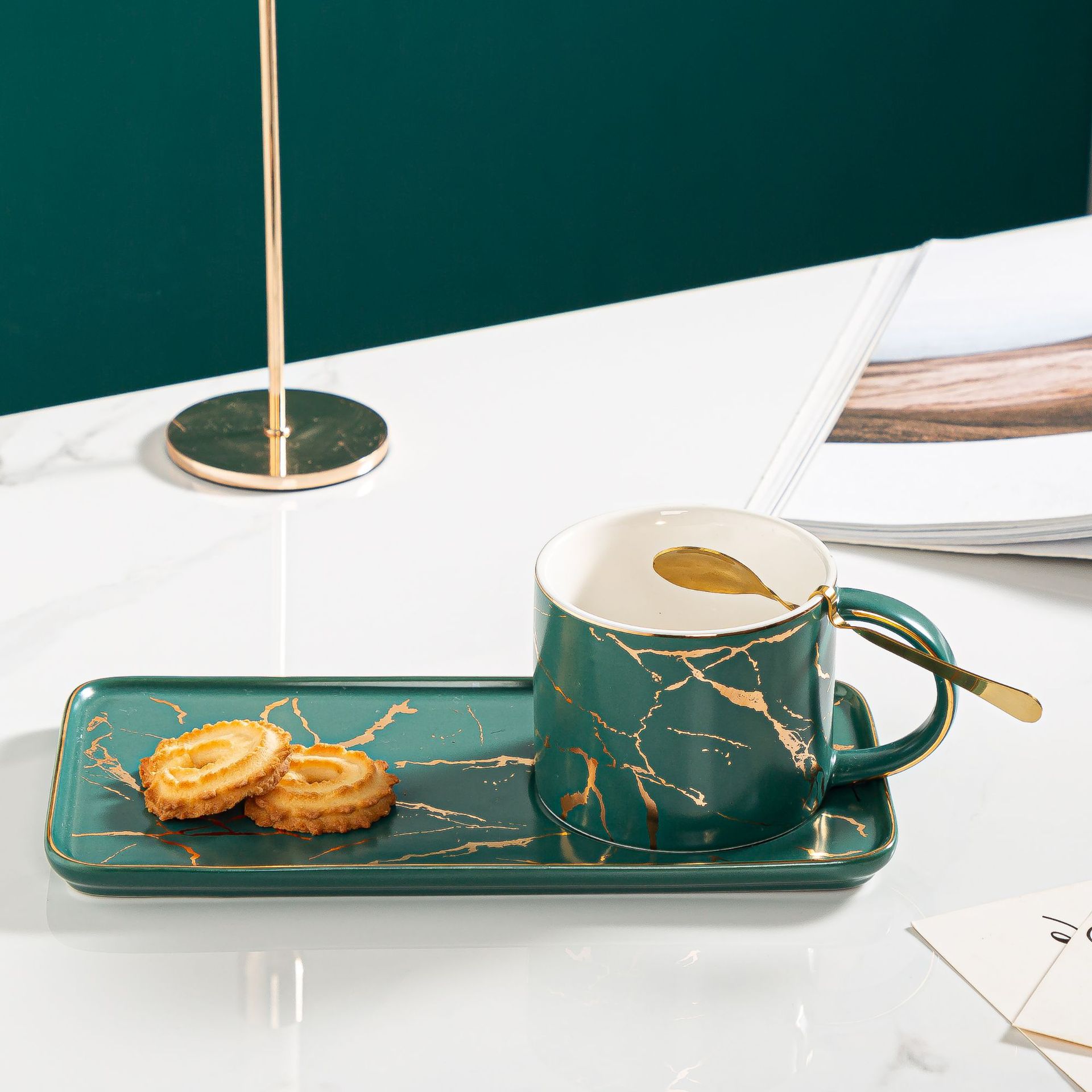 跨境陶瓷咖啡具套装墨绿描金陶瓷杯碟配金架商用礼品礼盒包装