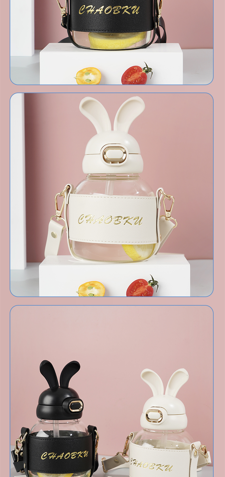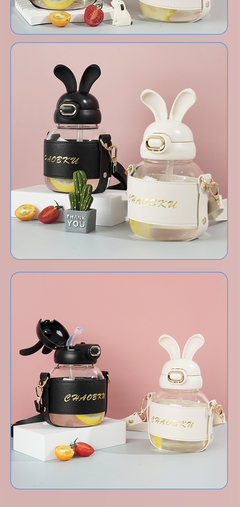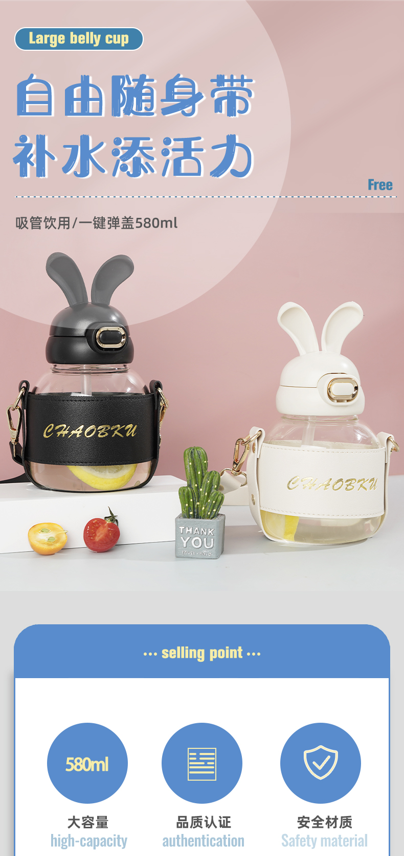 样品星兔创意卡通水杯儿童弹跳吸管杯可爱运动户外背带学生塑料杯