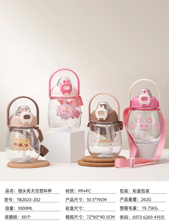样品星兔创意卡通水杯儿童弹跳吸管杯可爱运动户外背带学生塑料杯