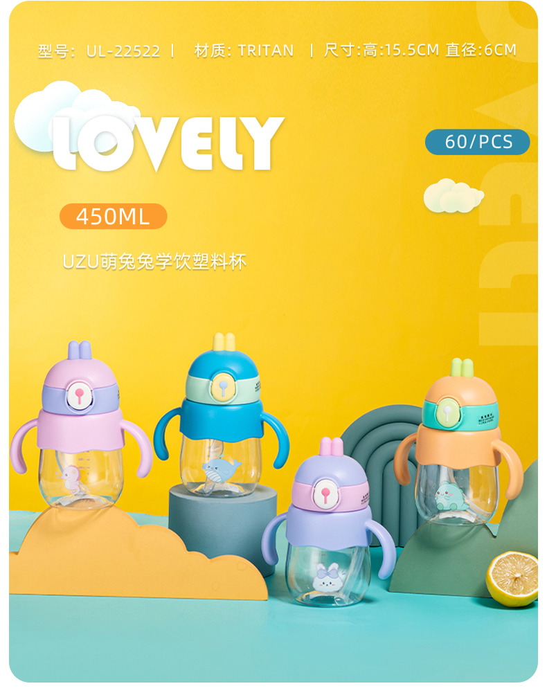 650MLUZU萌兔兔背带塑料杯儿童弹跳盖吸管杯(彩盒)