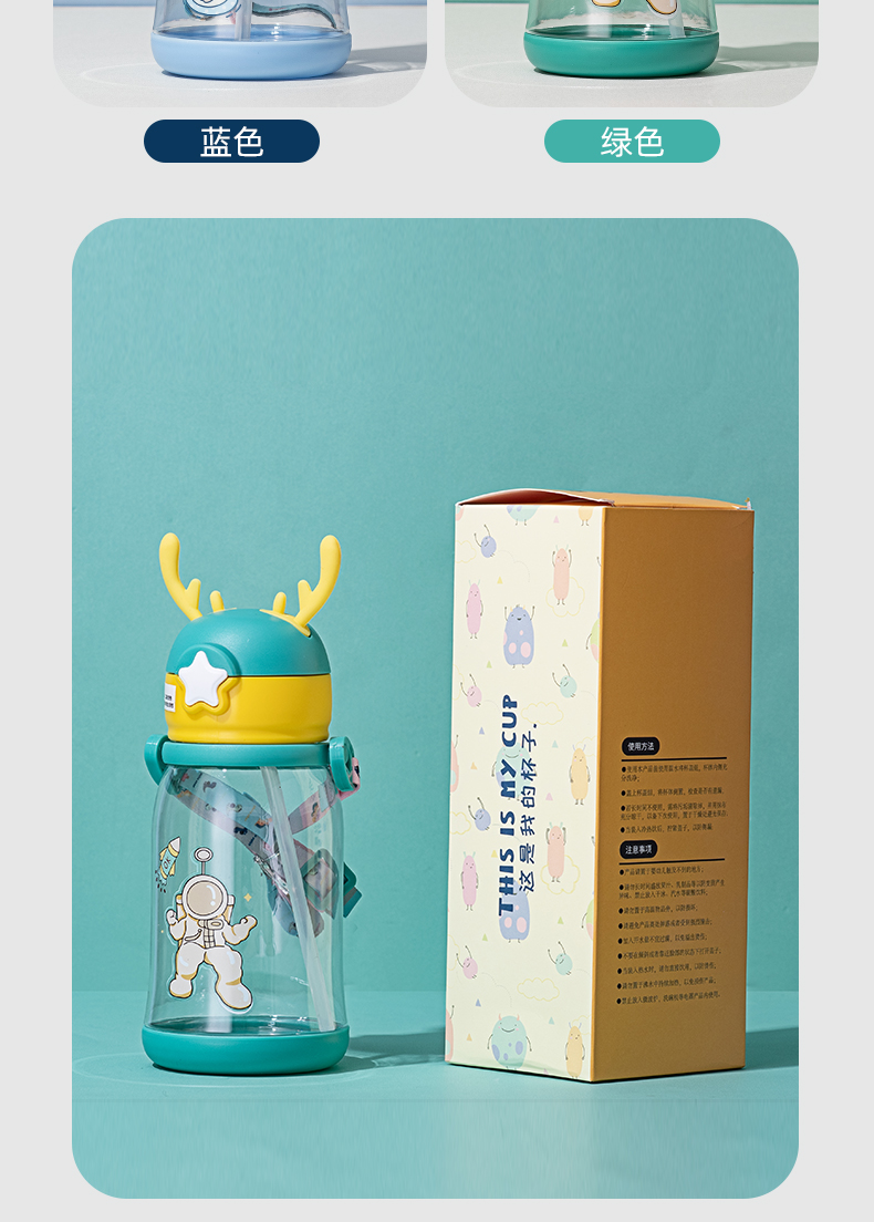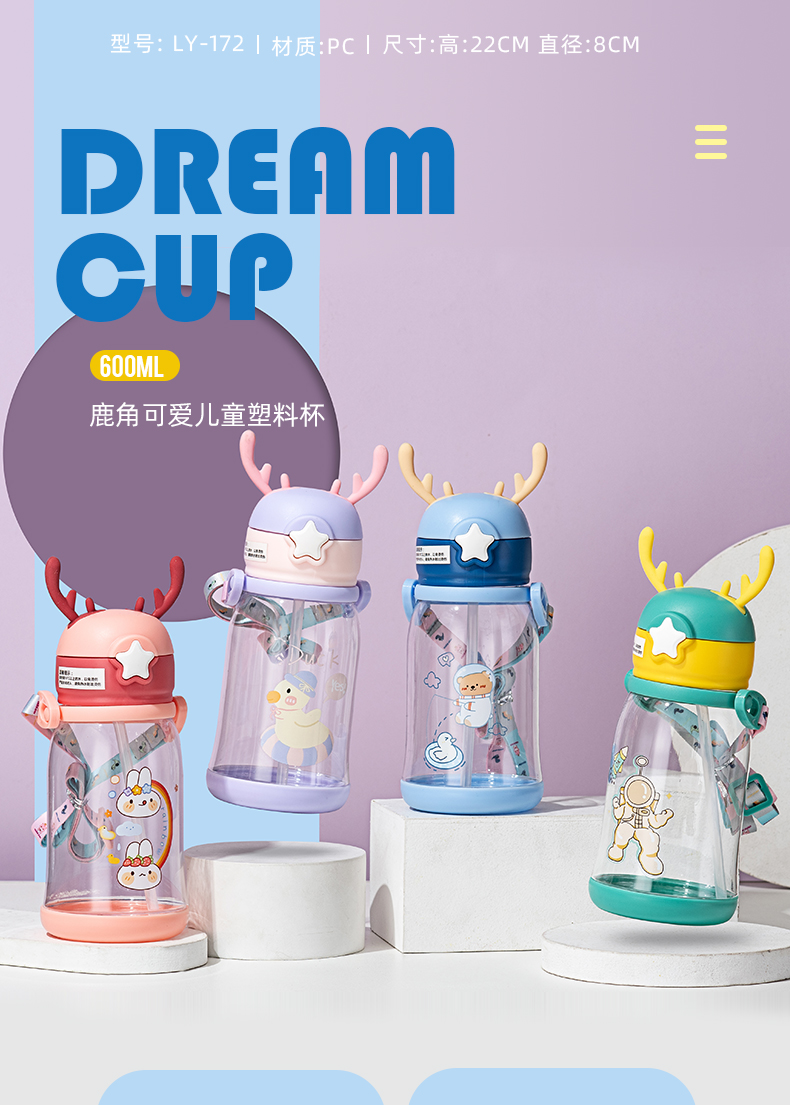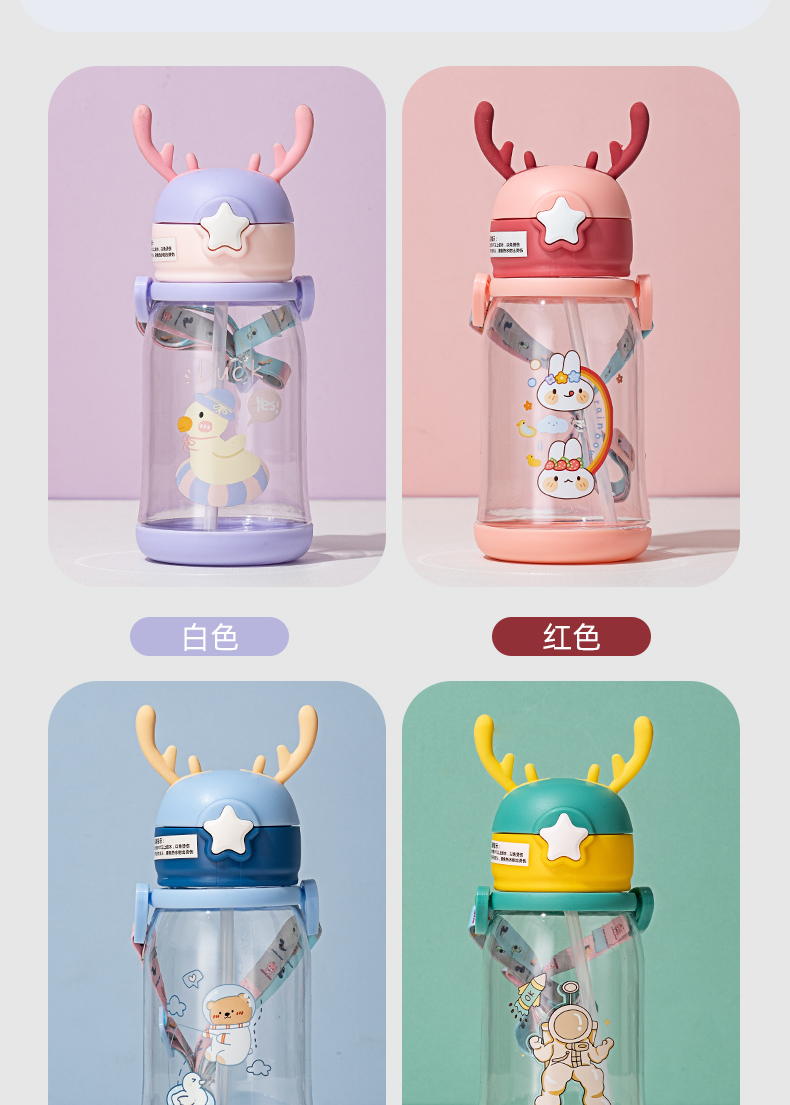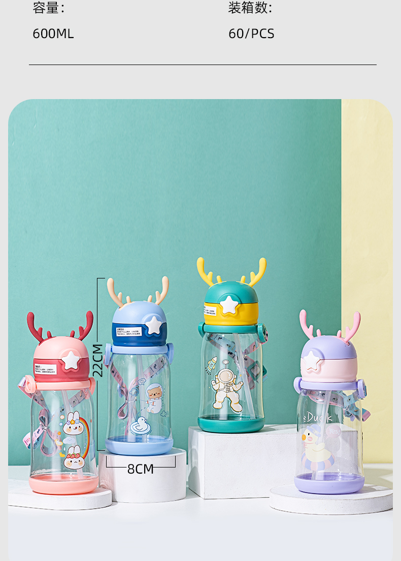 600ML卡通鹿角可爱儿童塑料杯便携背带弹盖吸管水杯