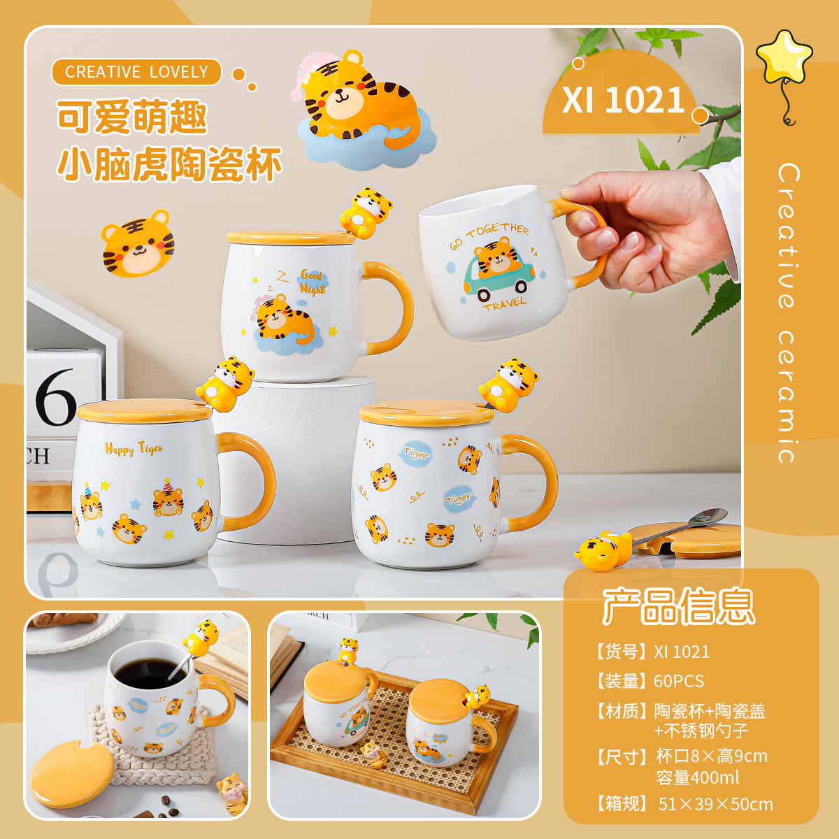 创意卡通恐龙陶瓷杯可爱ins礼品马克杯 情侣水杯咖啡杯带盖勺批发