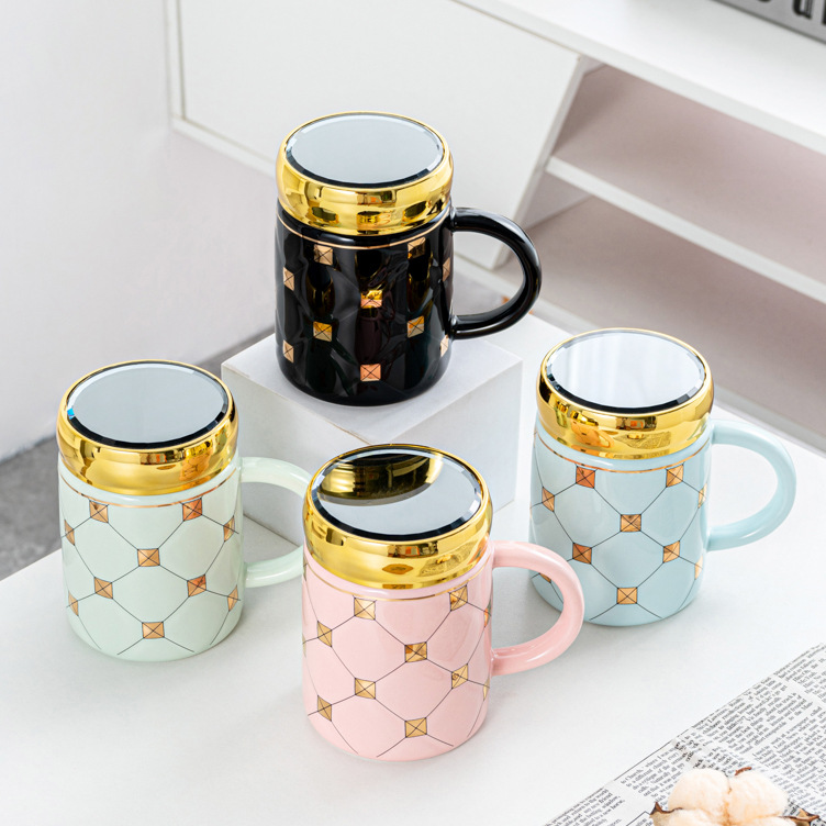 夏季高颜值大容量镜面保温杯带盖马克杯陶瓷杯情侣牛奶杯咖啡杯