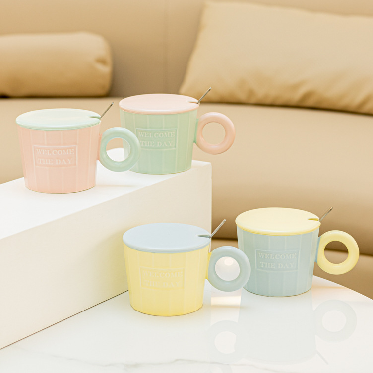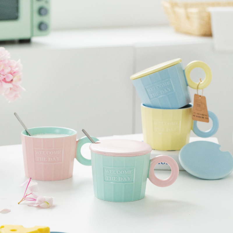 糖果色浮雕英文马克杯带盖情侣牛奶杯高颜值网红咖啡杯创意水杯