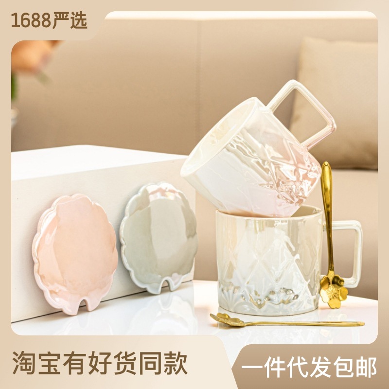 ins渐变色珍珠水杯少女心陶瓷杯带盖勺办公室咖啡杯马克杯高颜值