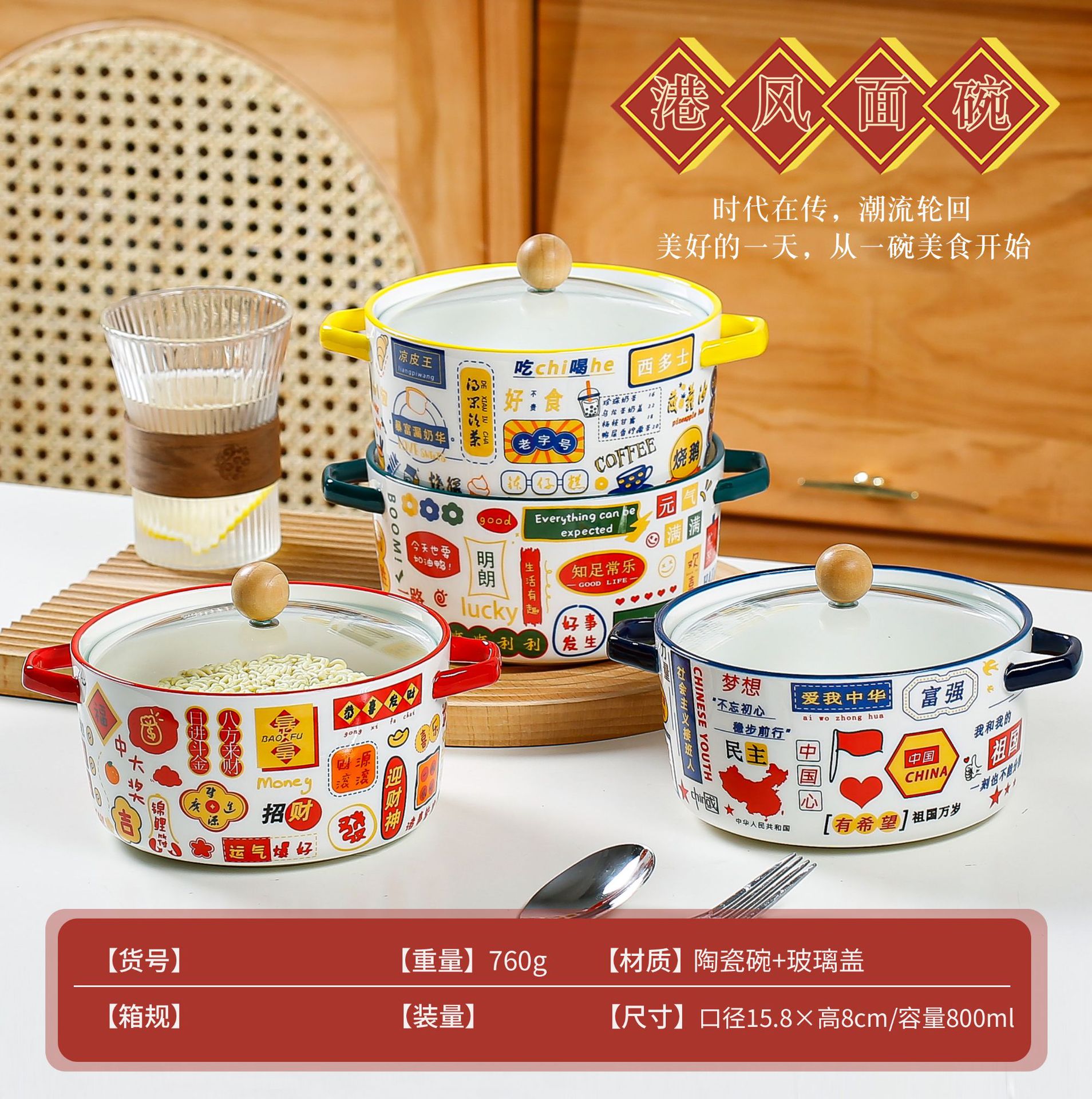 创意卡通双耳家用泡面碗超大容量玻璃盖子双耳汤碗礼品印LOGO