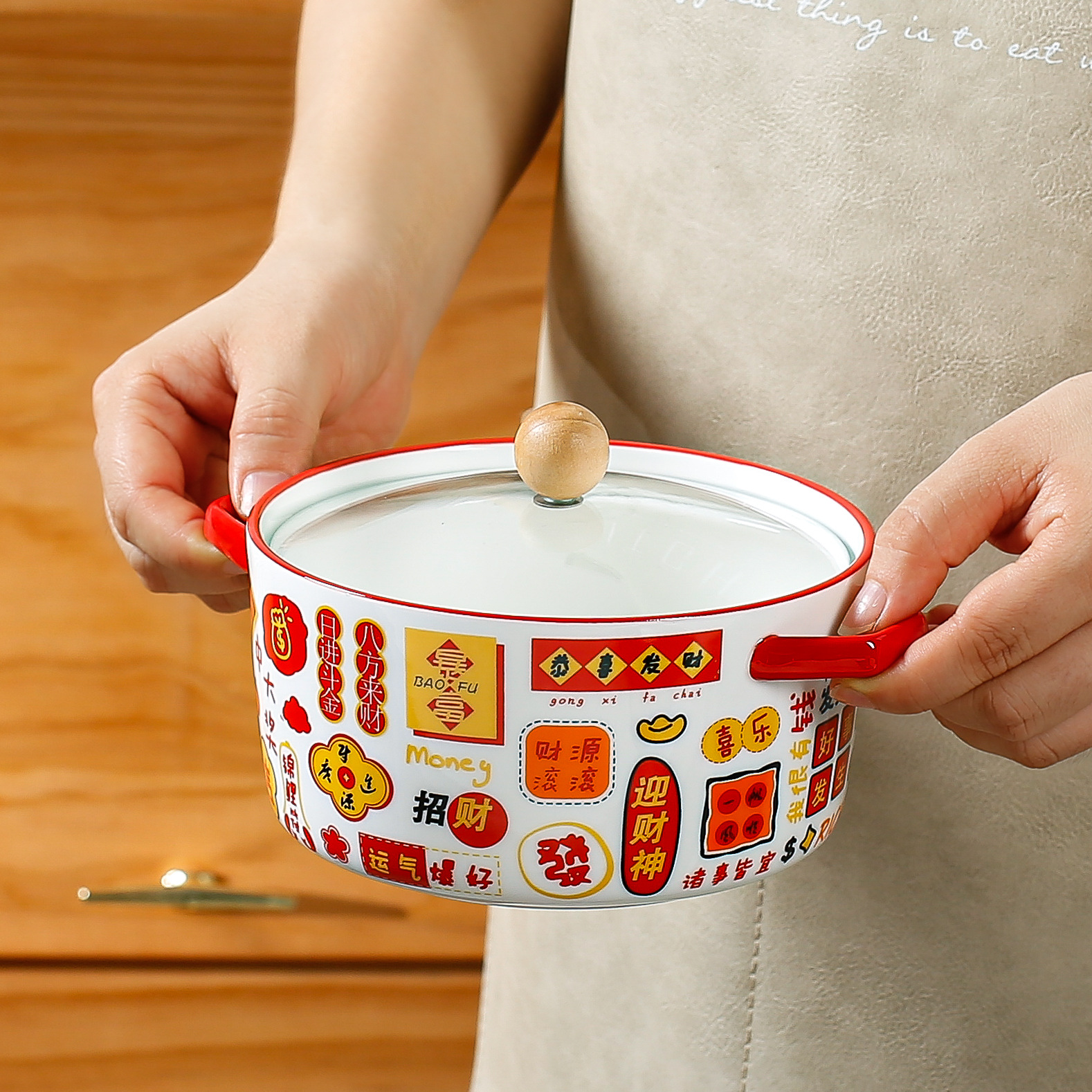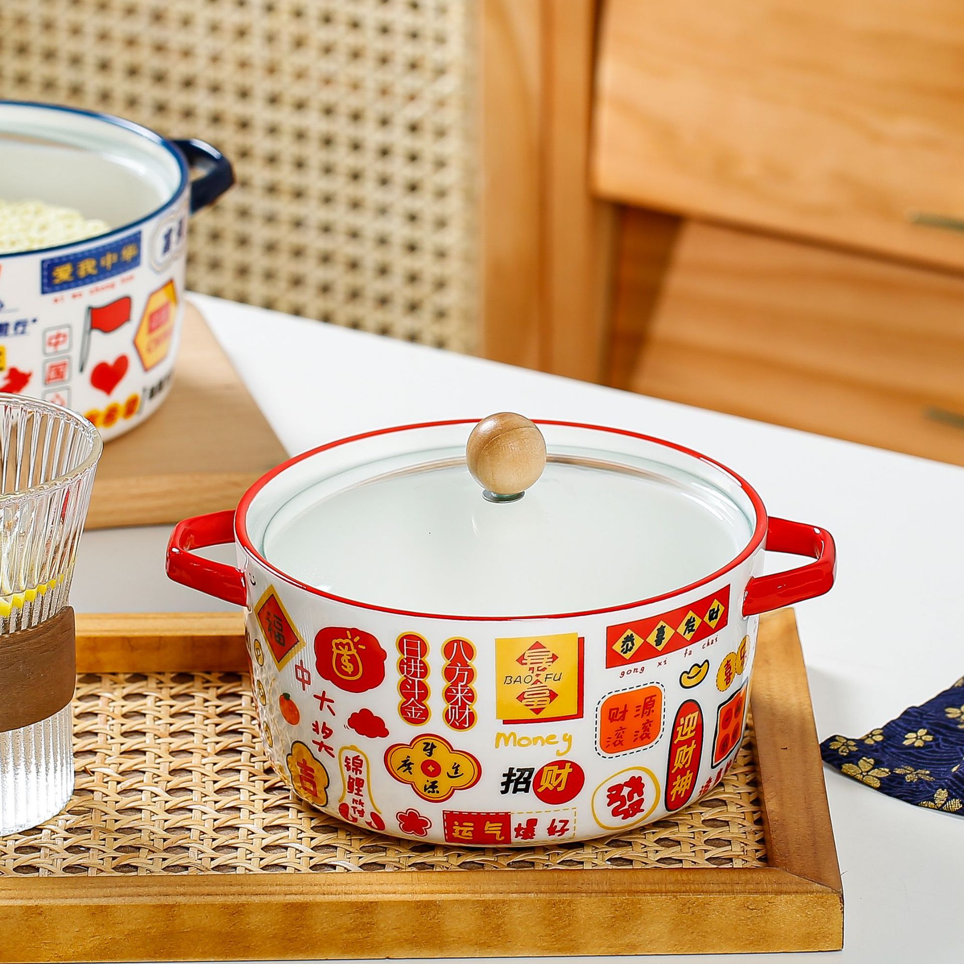 兔年双耳陶瓷面碗家用大容量泡面碗电镀金银边汤碗钢化透明玻璃盖