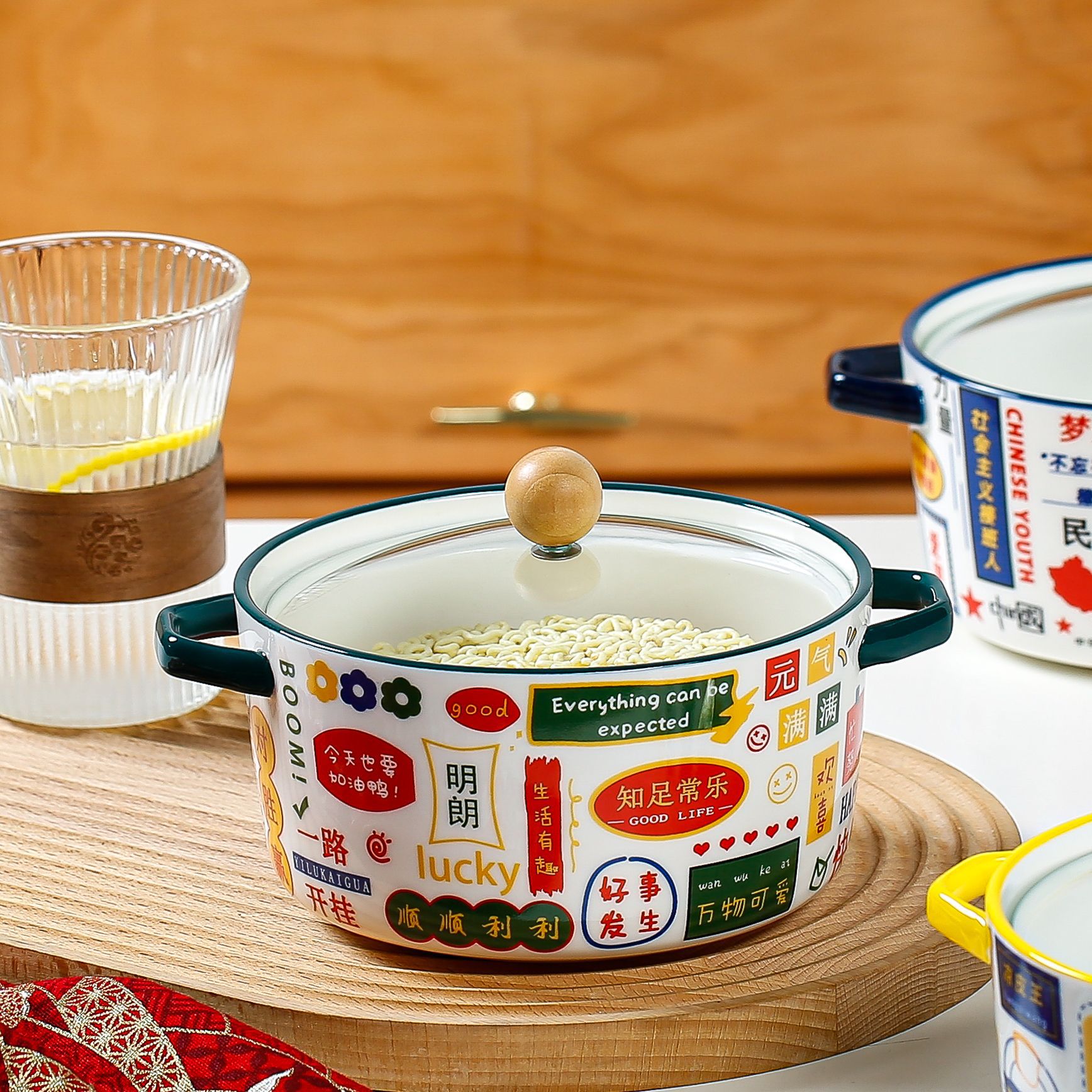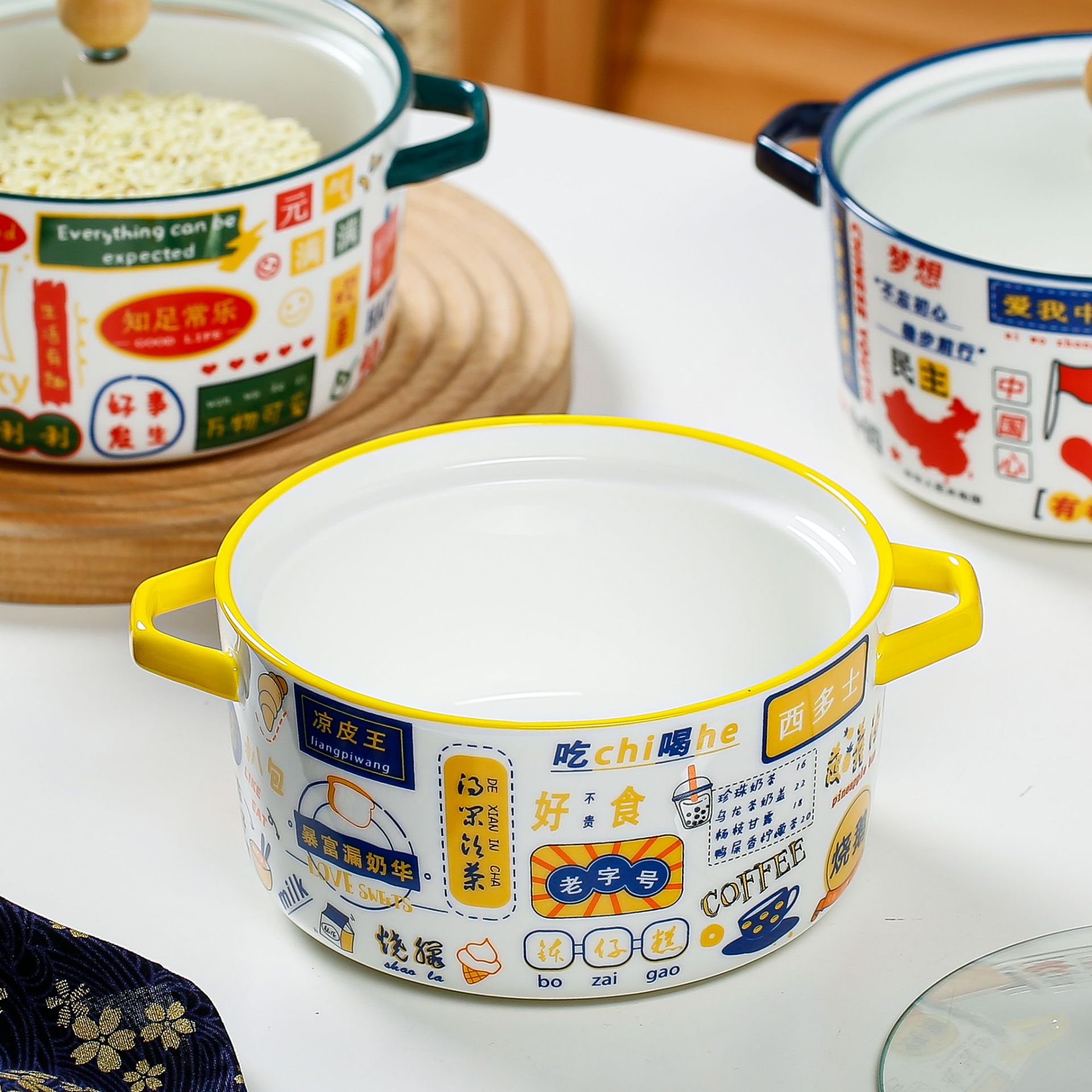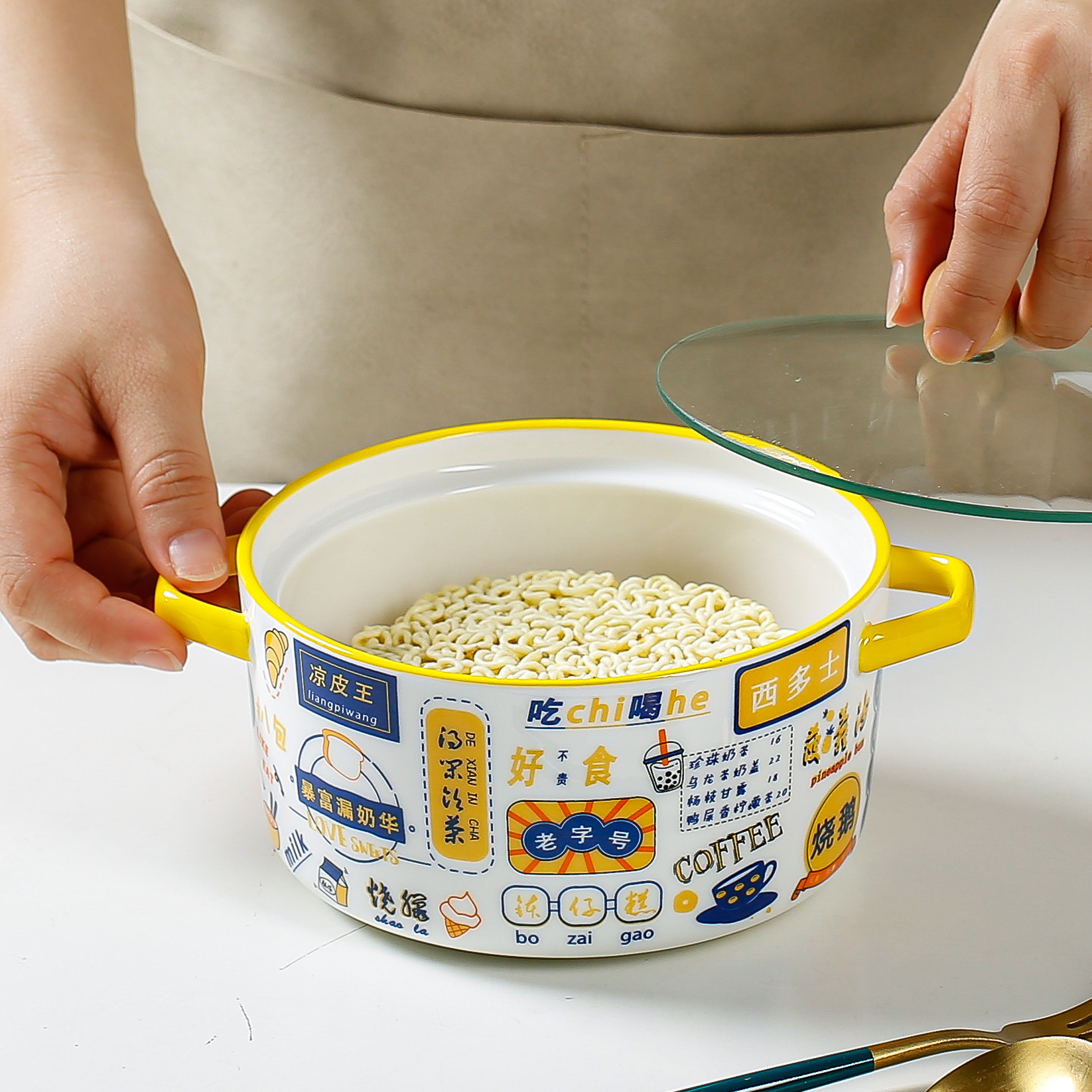北欧创意陶瓷泡面碗带盖 家用保鲜碗 双耳汤碗可爱餐具微波炉瓷碗