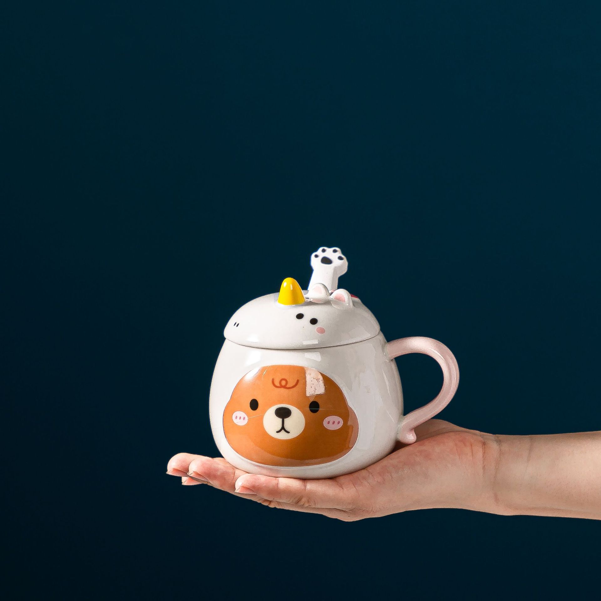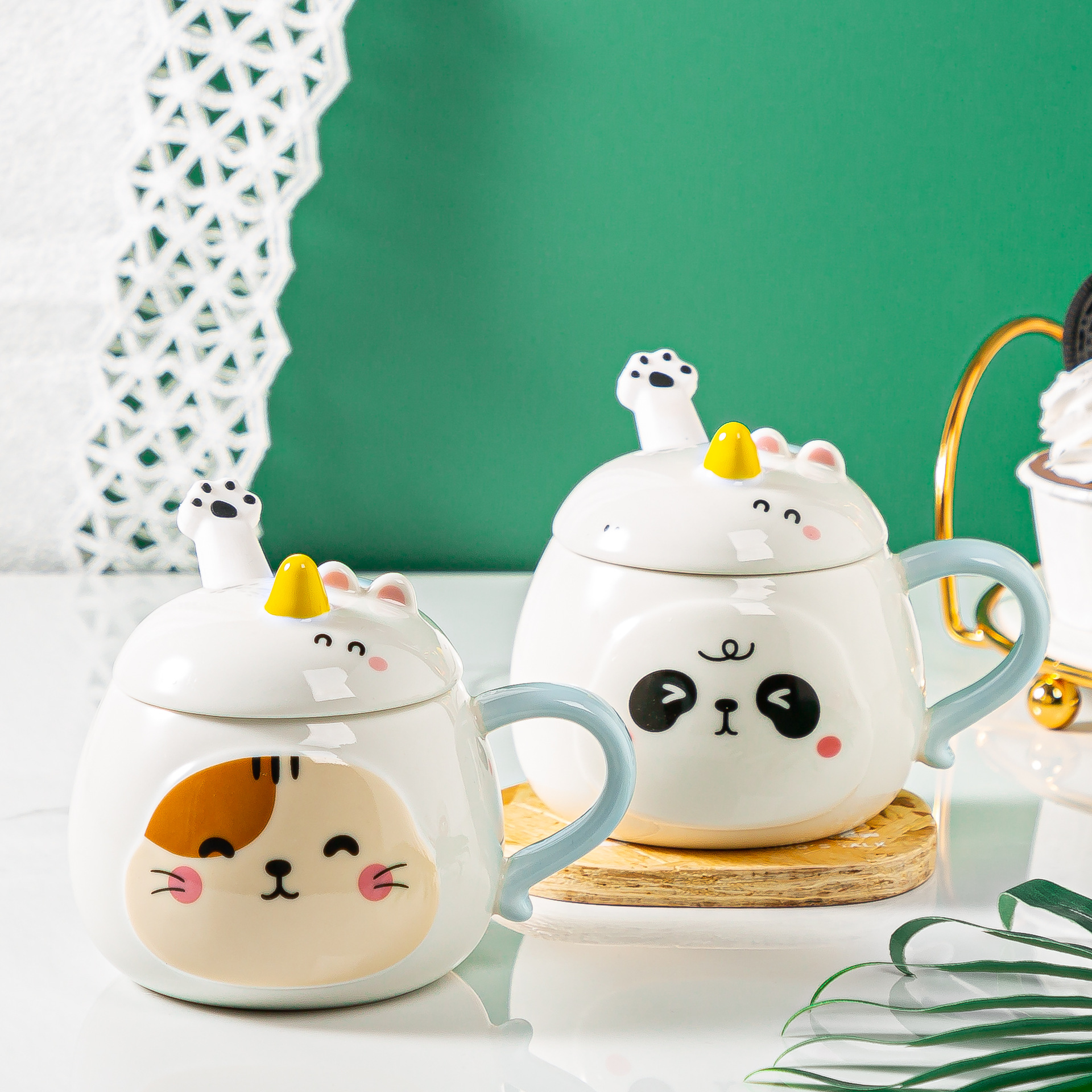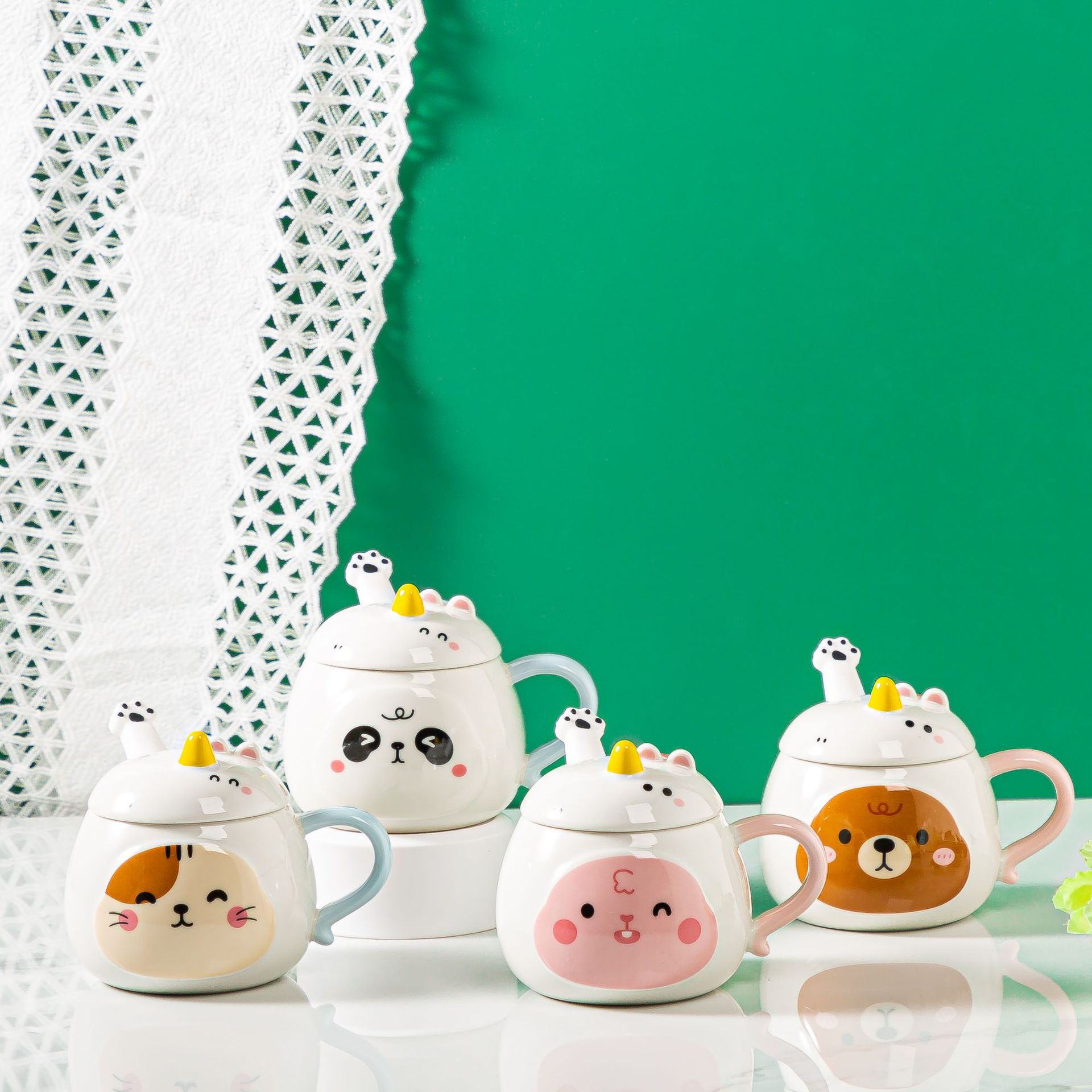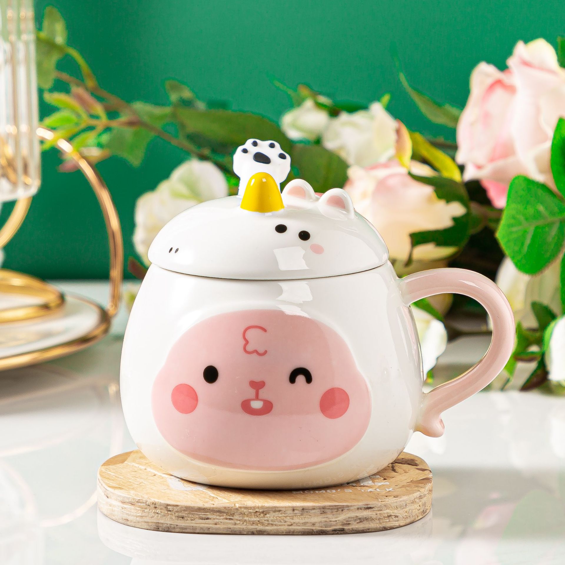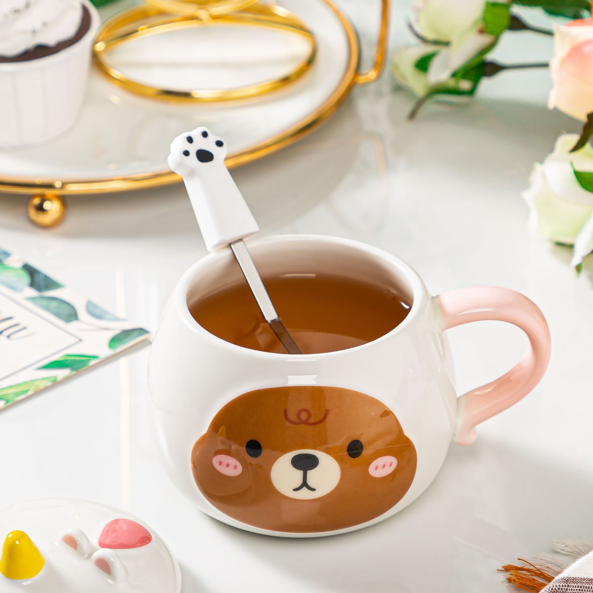 创意浮雕带盖马克杯可爱少女心陶瓷杯女生牛奶咖啡杯卡通熊镜面杯