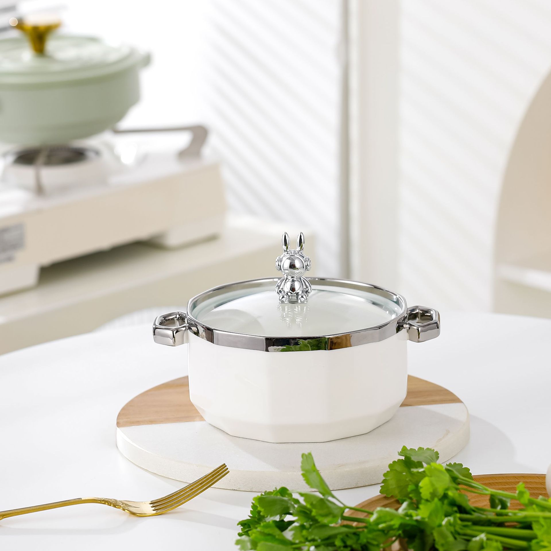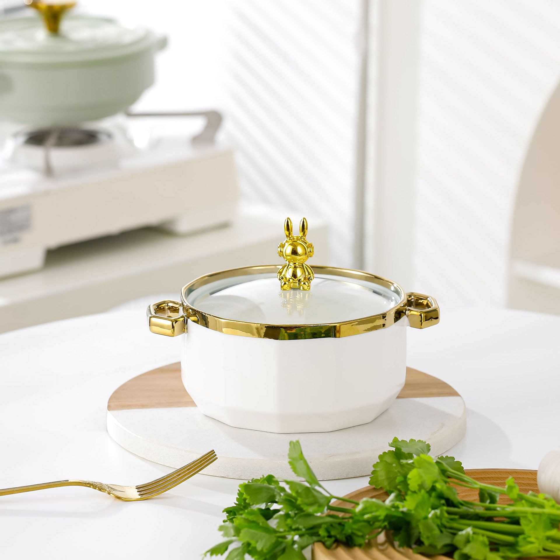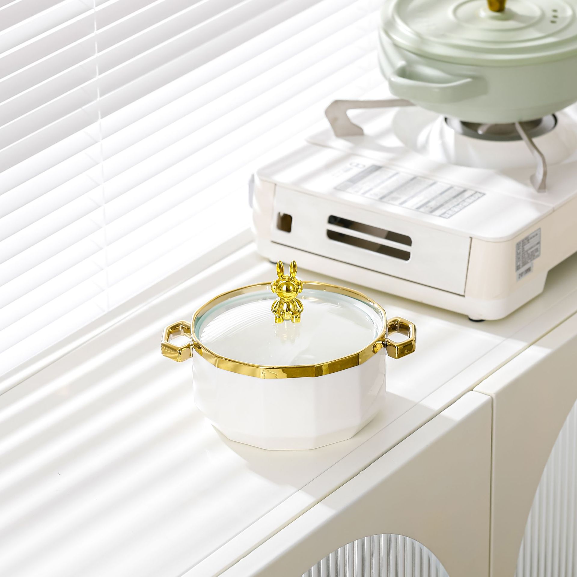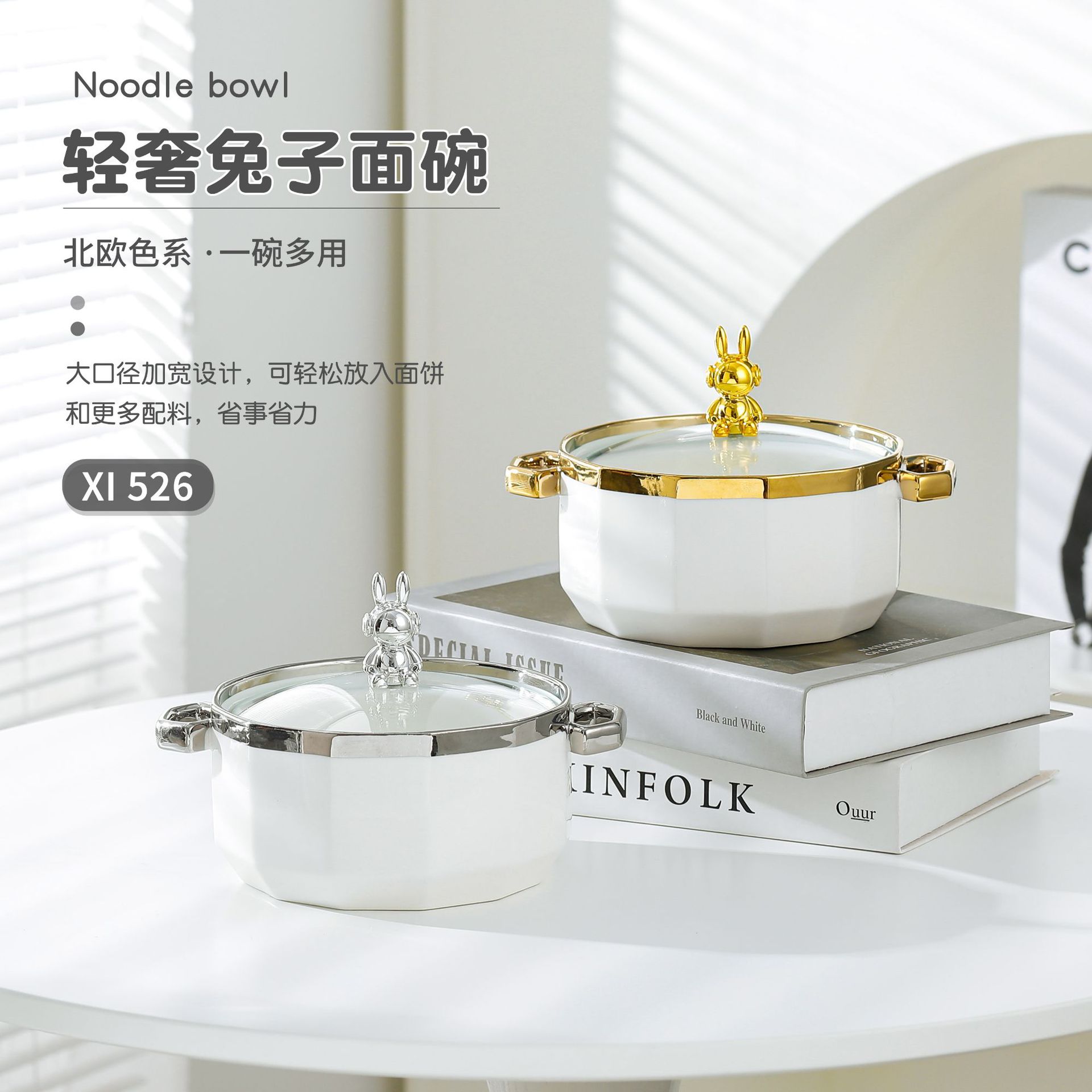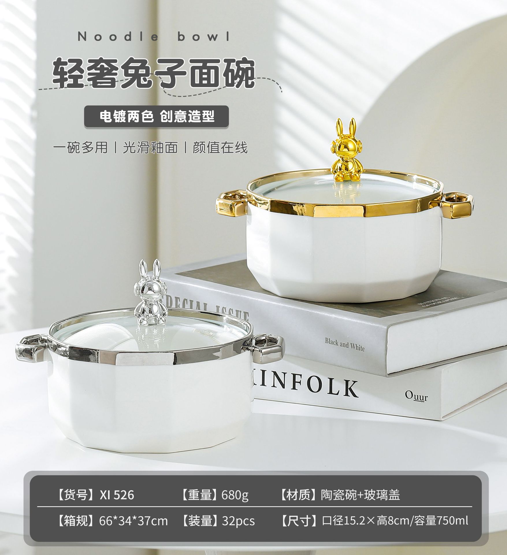 兔年双耳陶瓷面碗家用大容量泡面碗电镀金银边汤碗钢化透明玻璃盖
