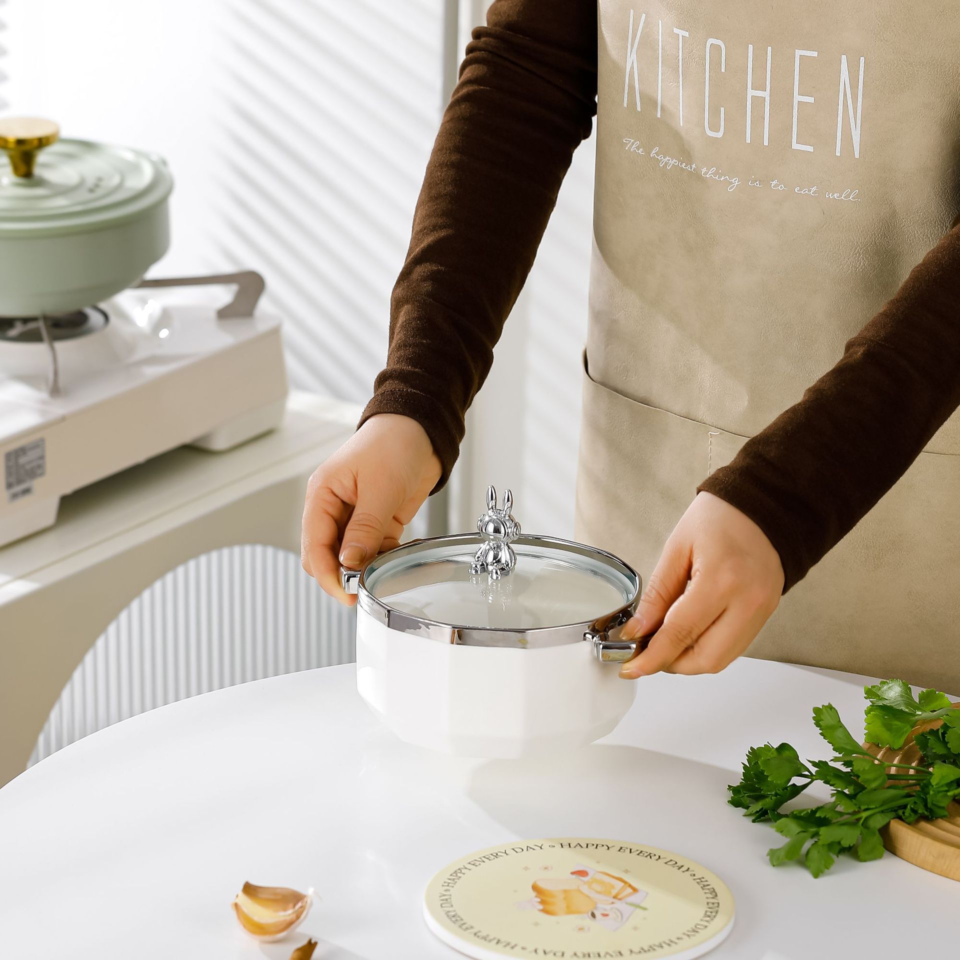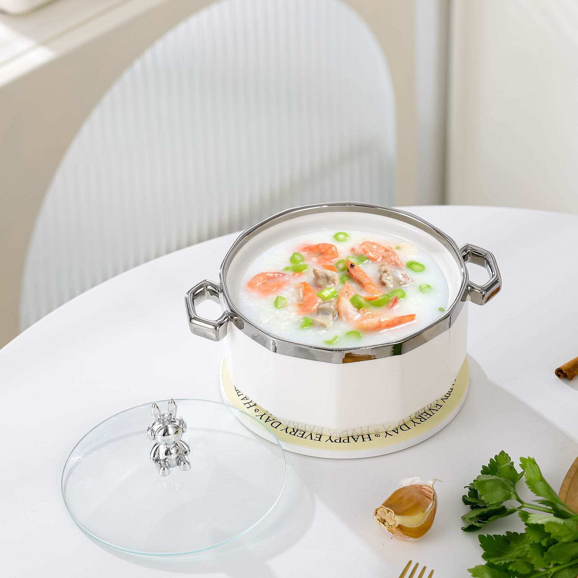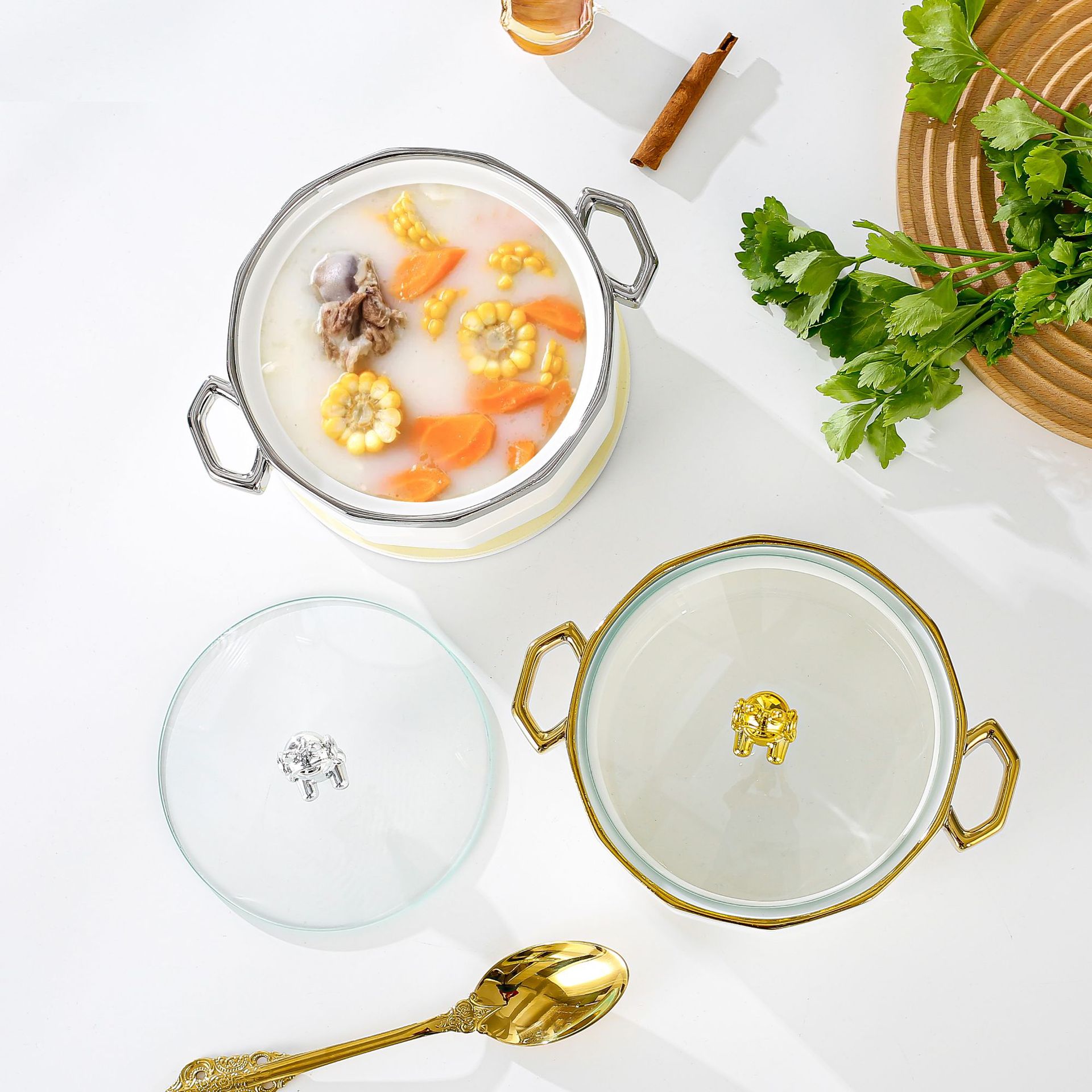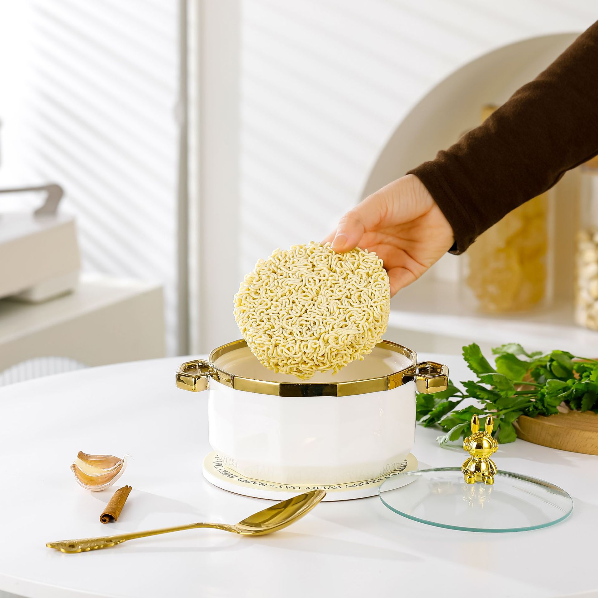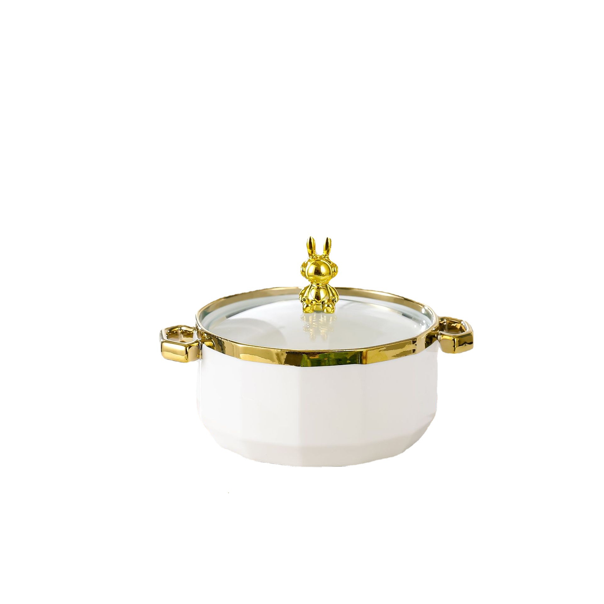 兔年双耳陶瓷面碗家用大容量泡面碗电镀金银边汤碗钢化透明玻璃盖