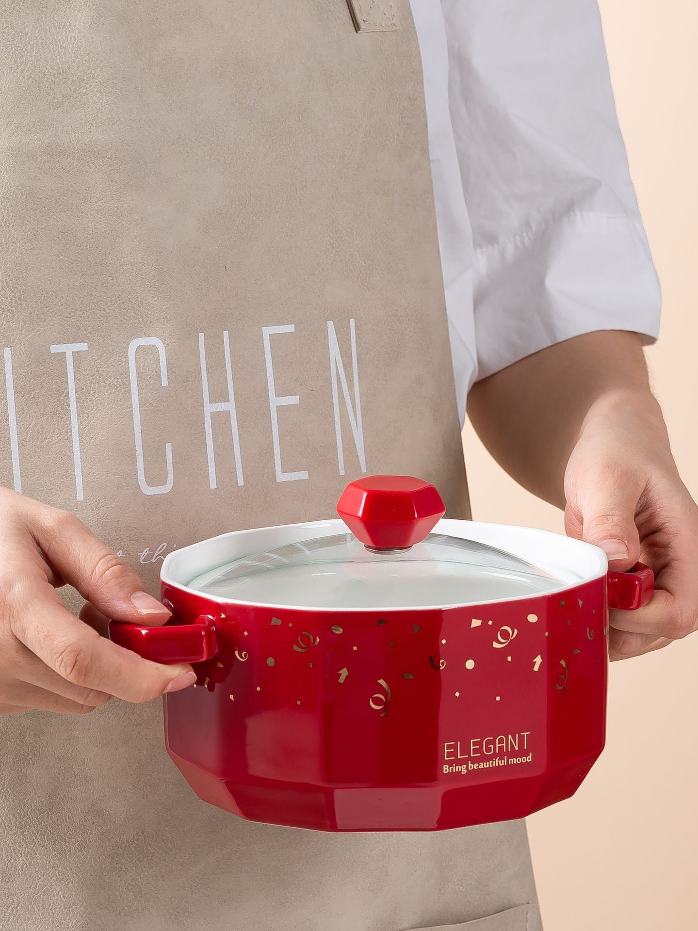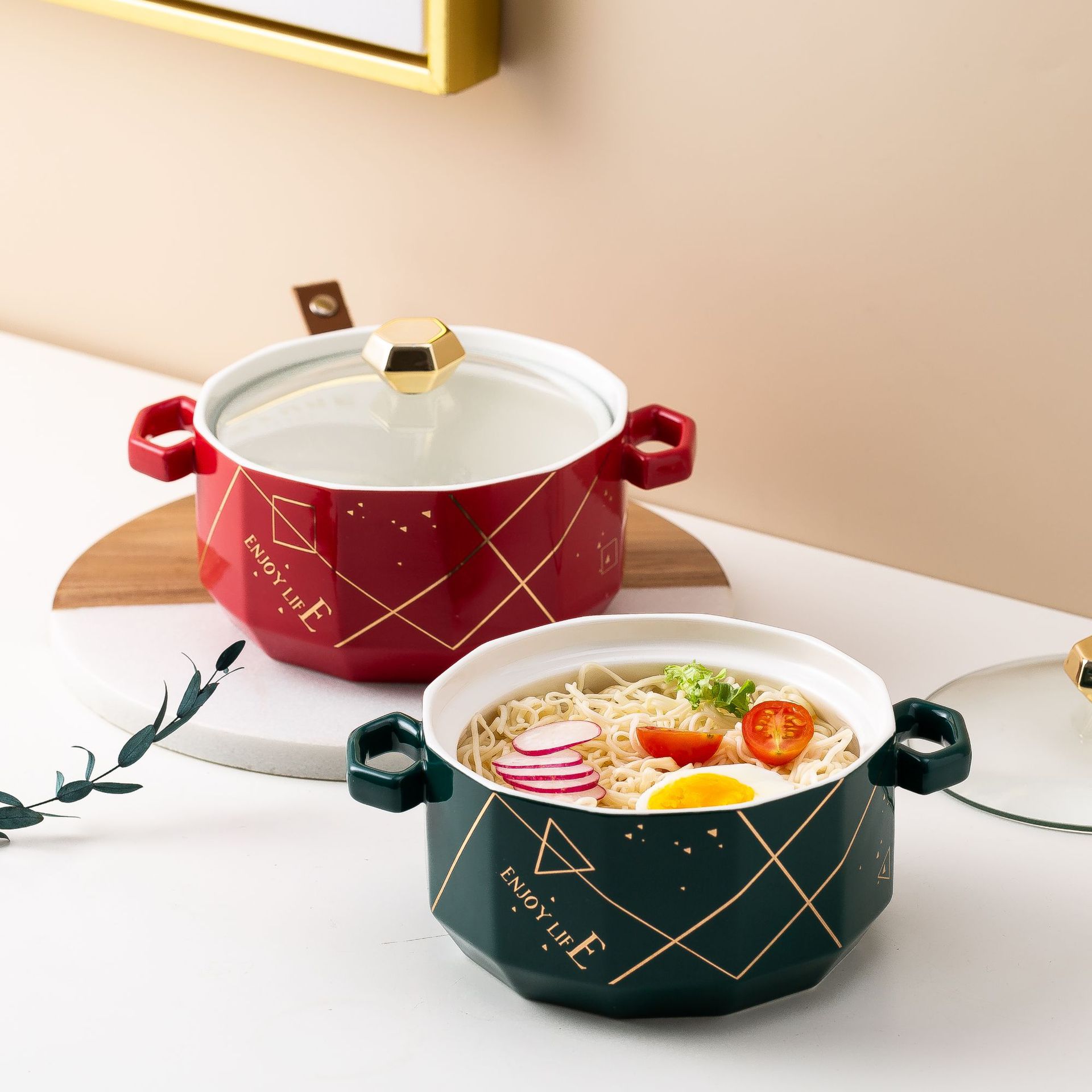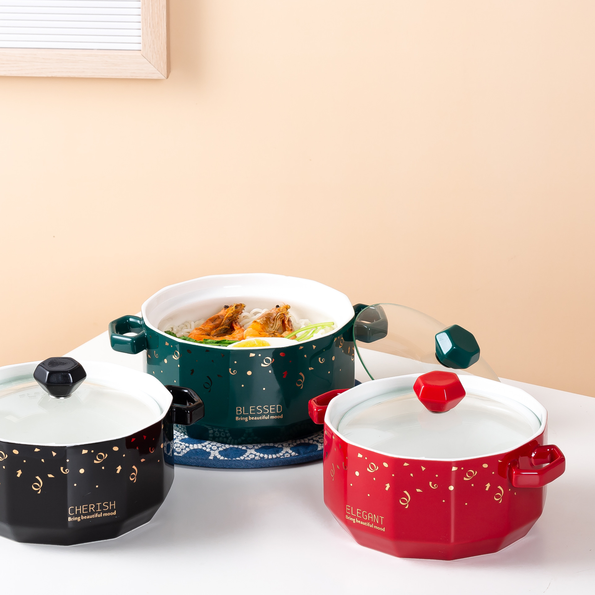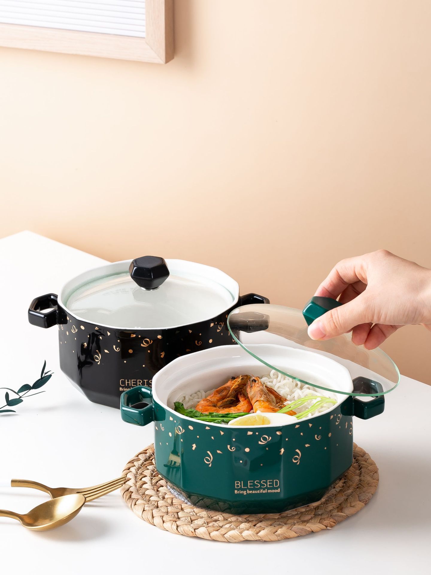 兔年双耳陶瓷面碗家用大容量泡面碗电镀金银边汤碗钢化透明玻璃盖