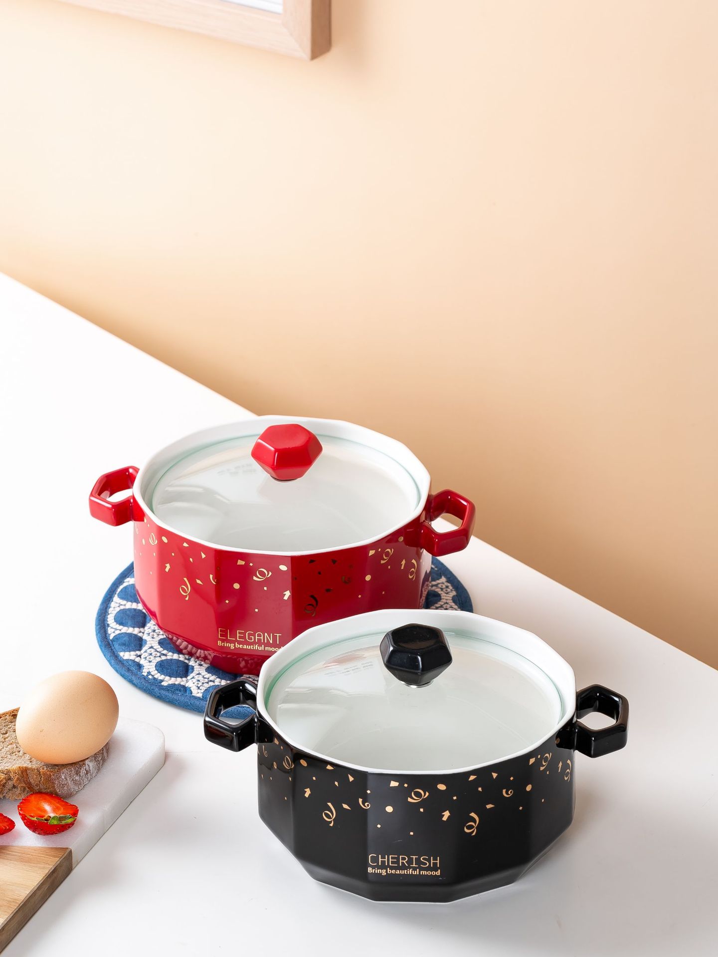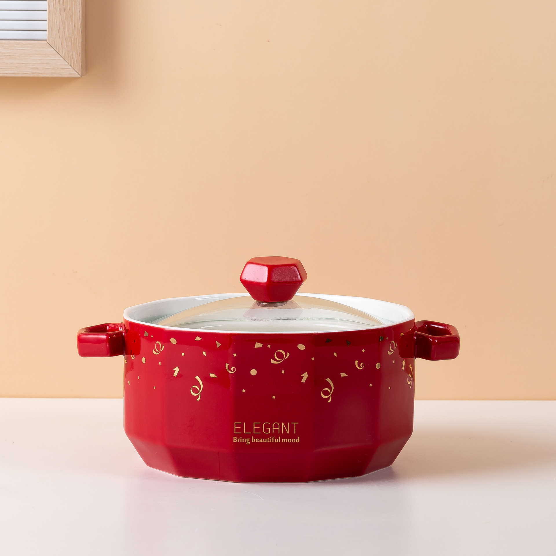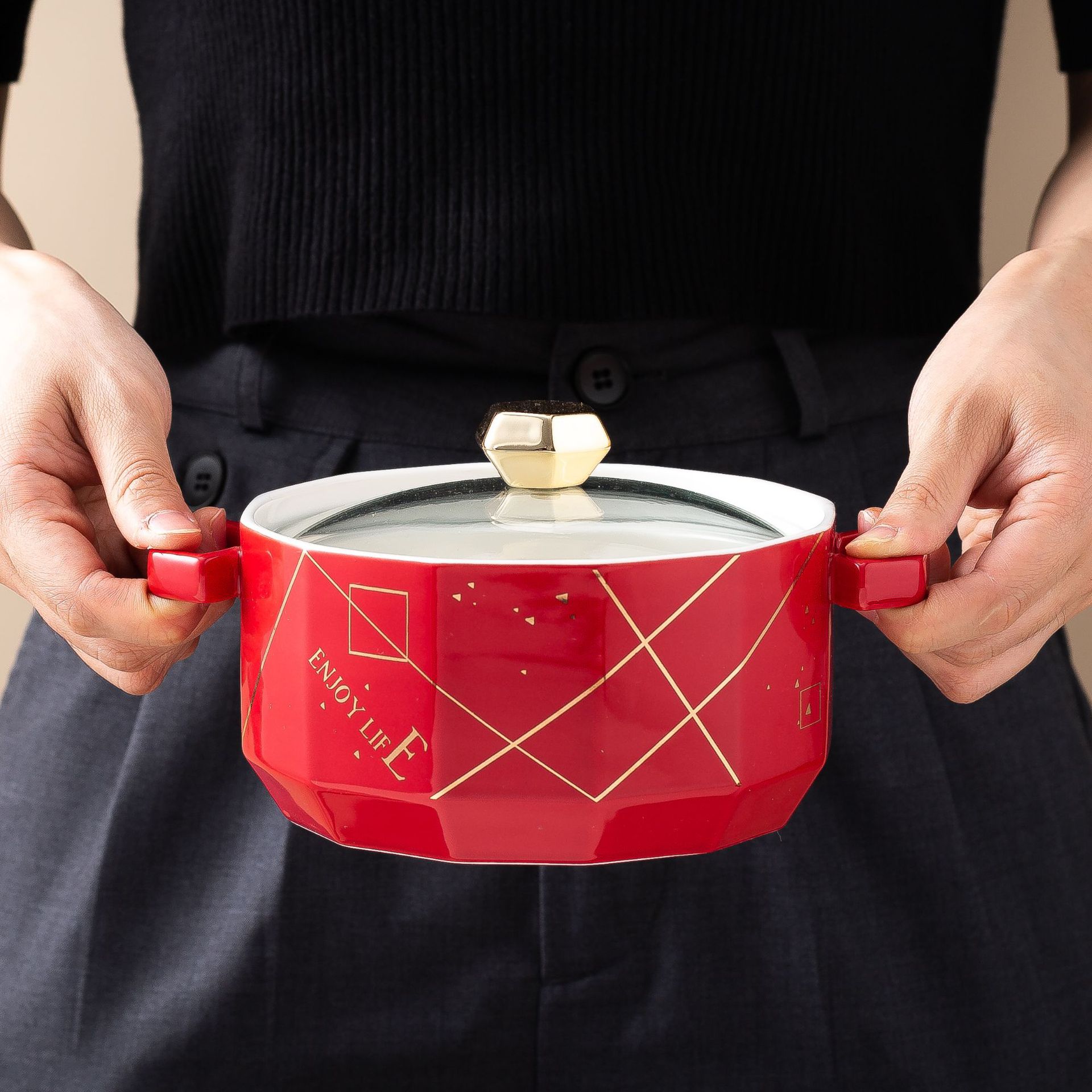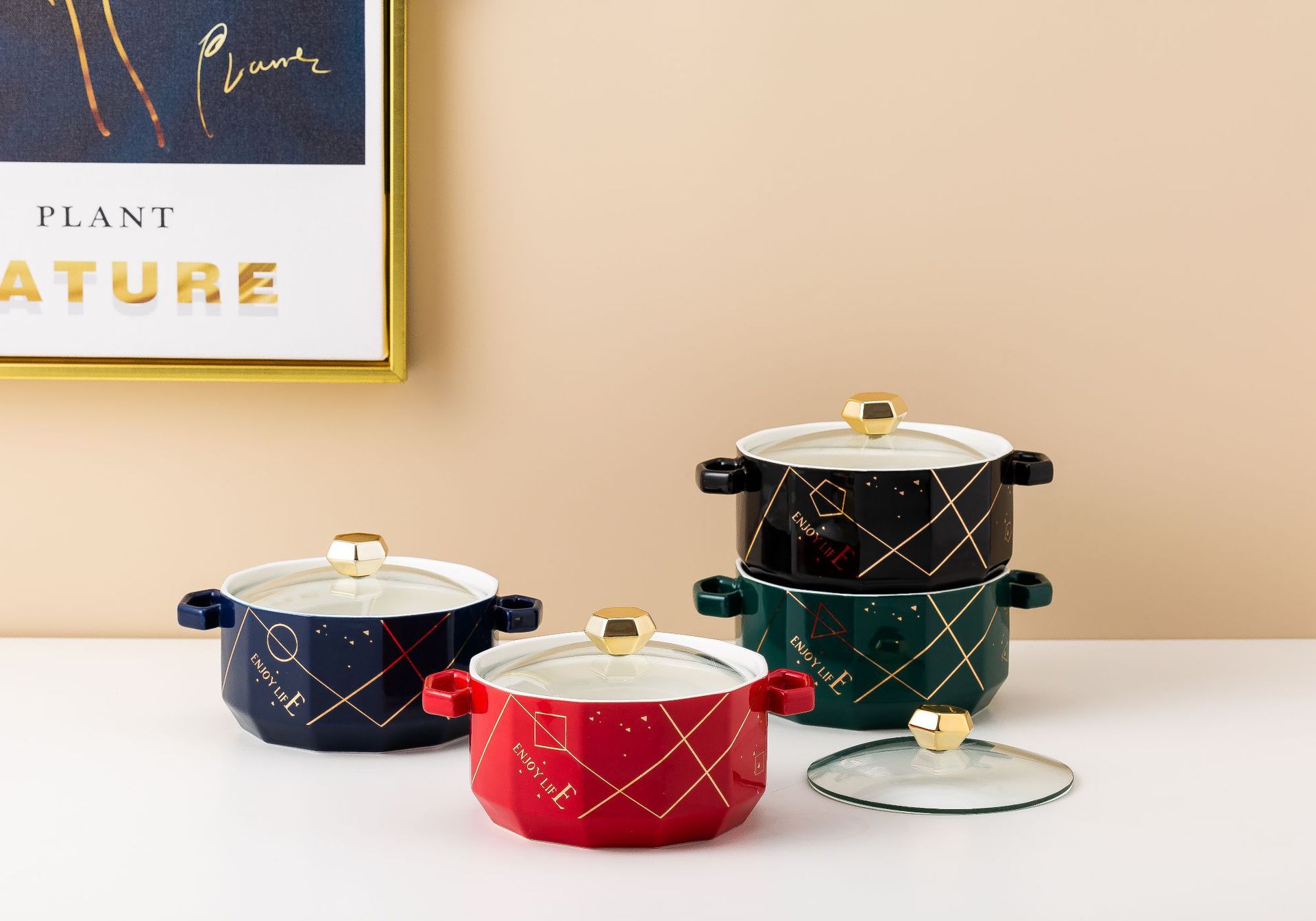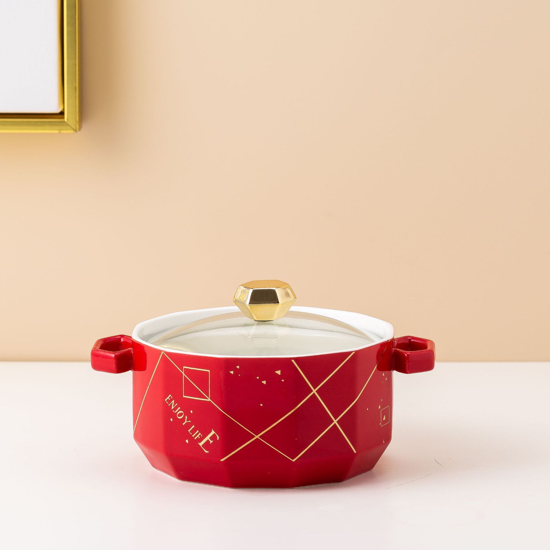 兔年双耳陶瓷面碗家用大容量泡面碗电镀金银边汤碗钢化透明玻璃盖