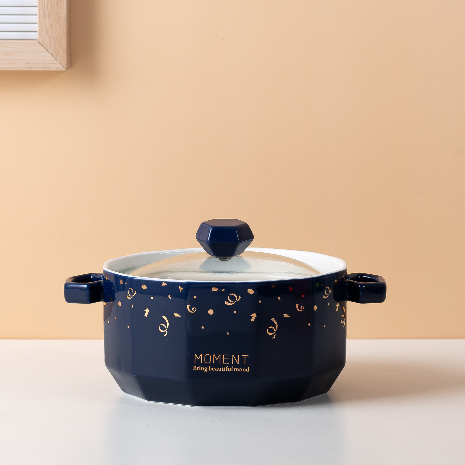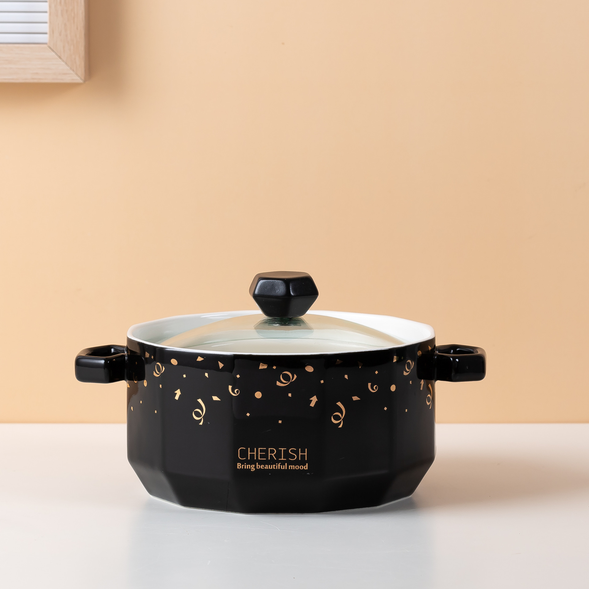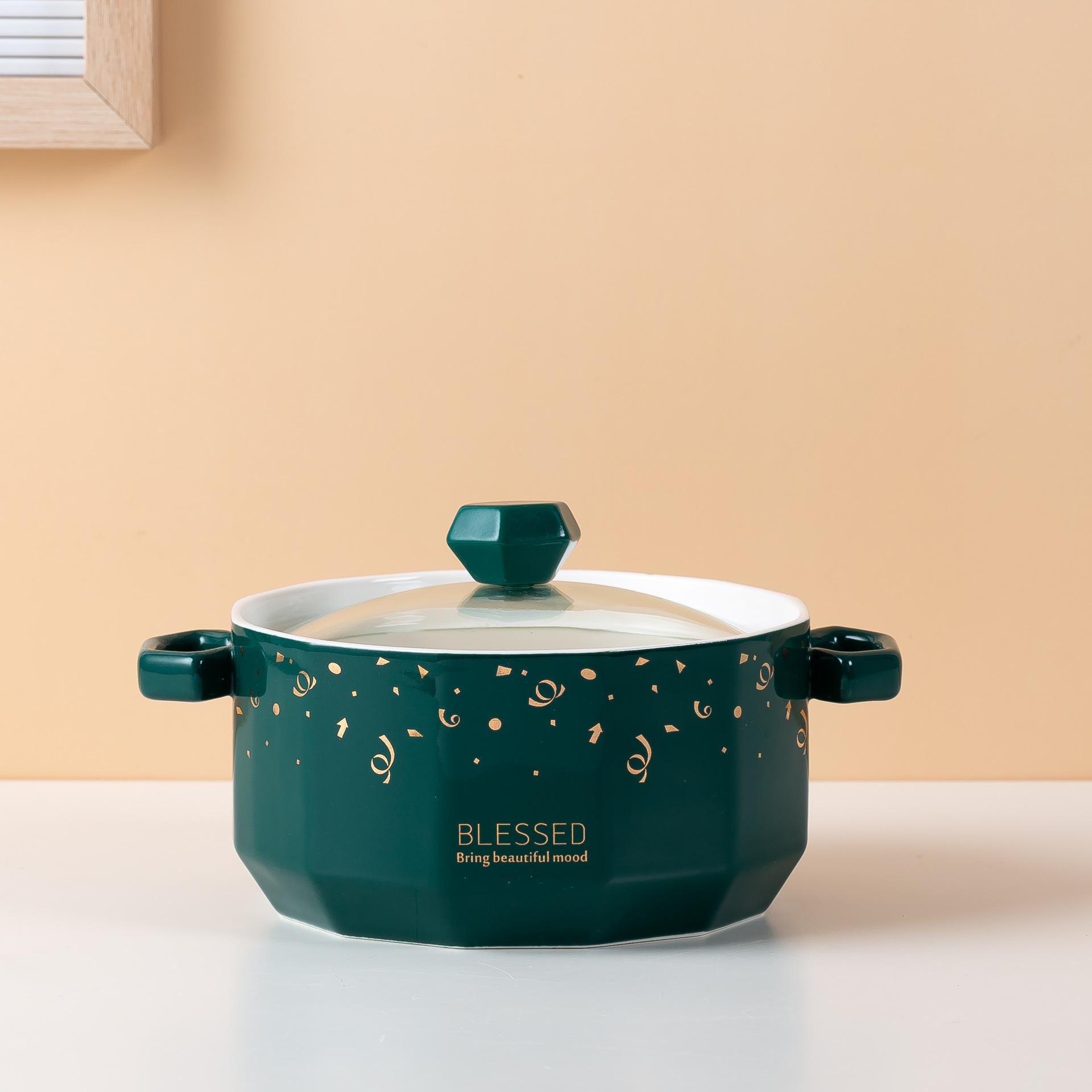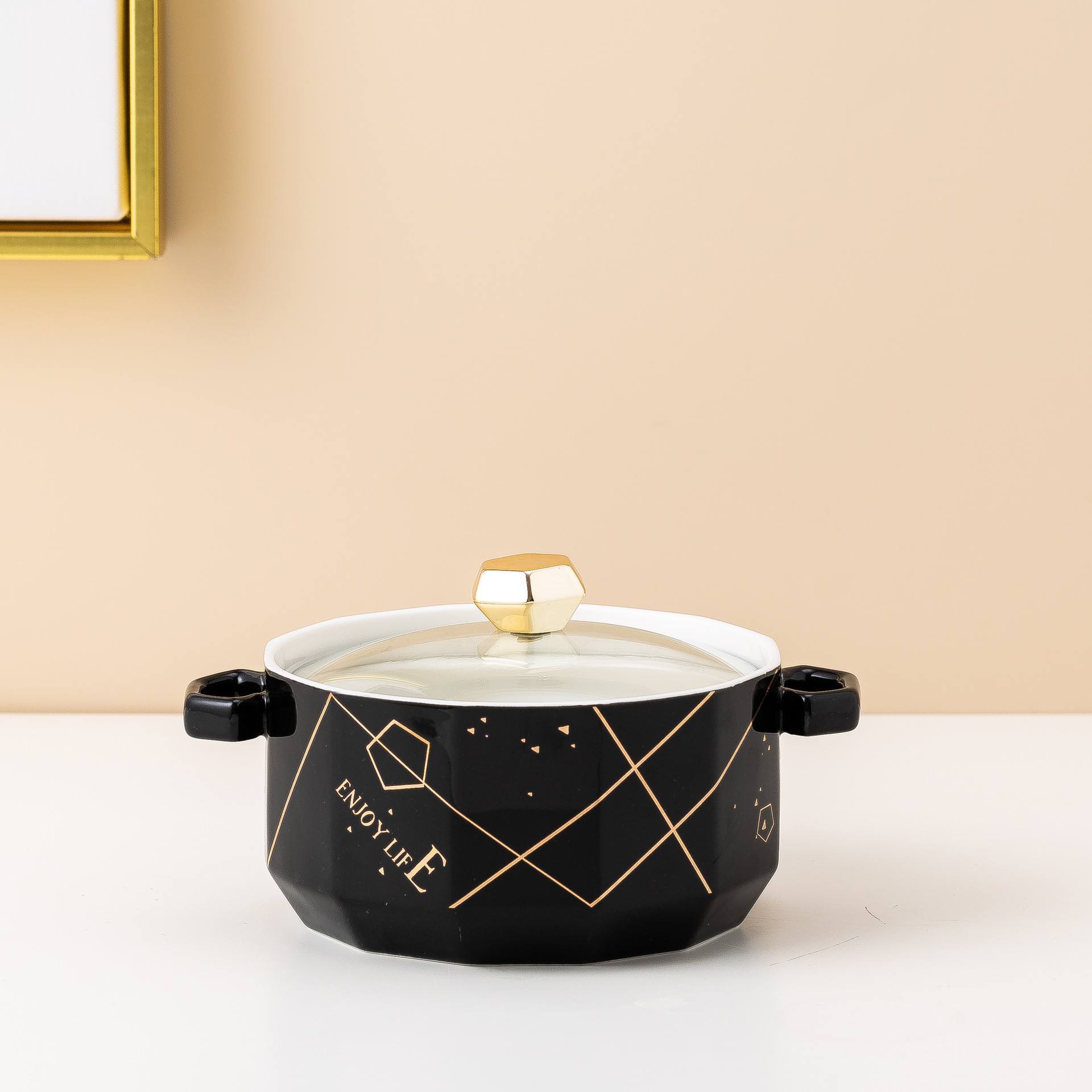 兔年双耳陶瓷面碗家用大容量泡面碗电镀金银边汤碗钢化透明玻璃盖