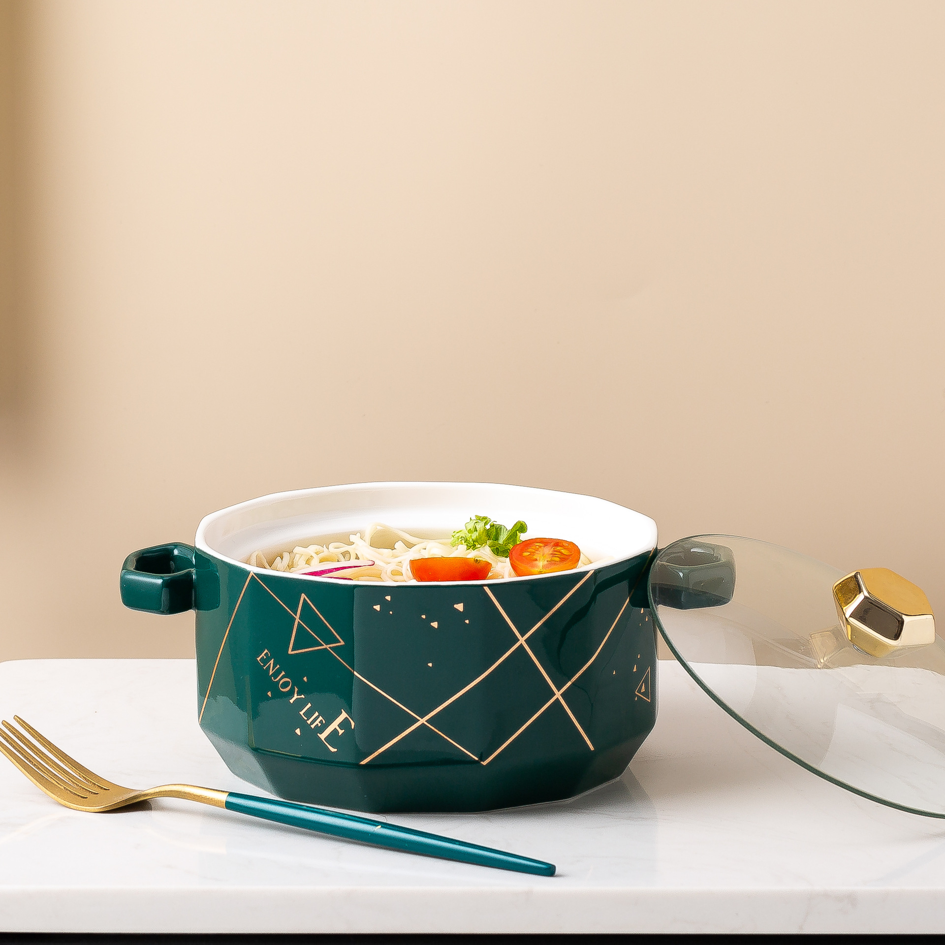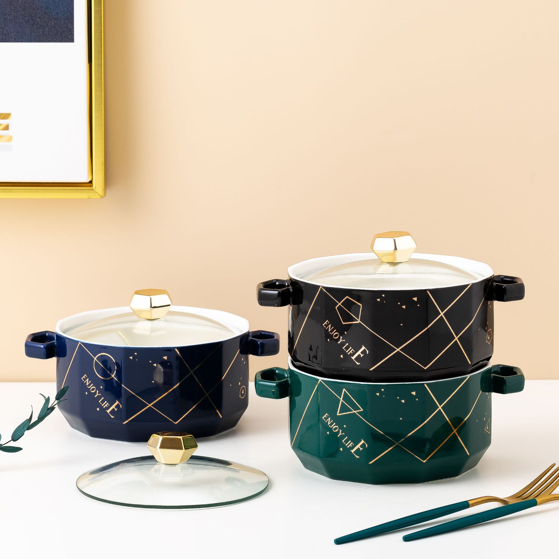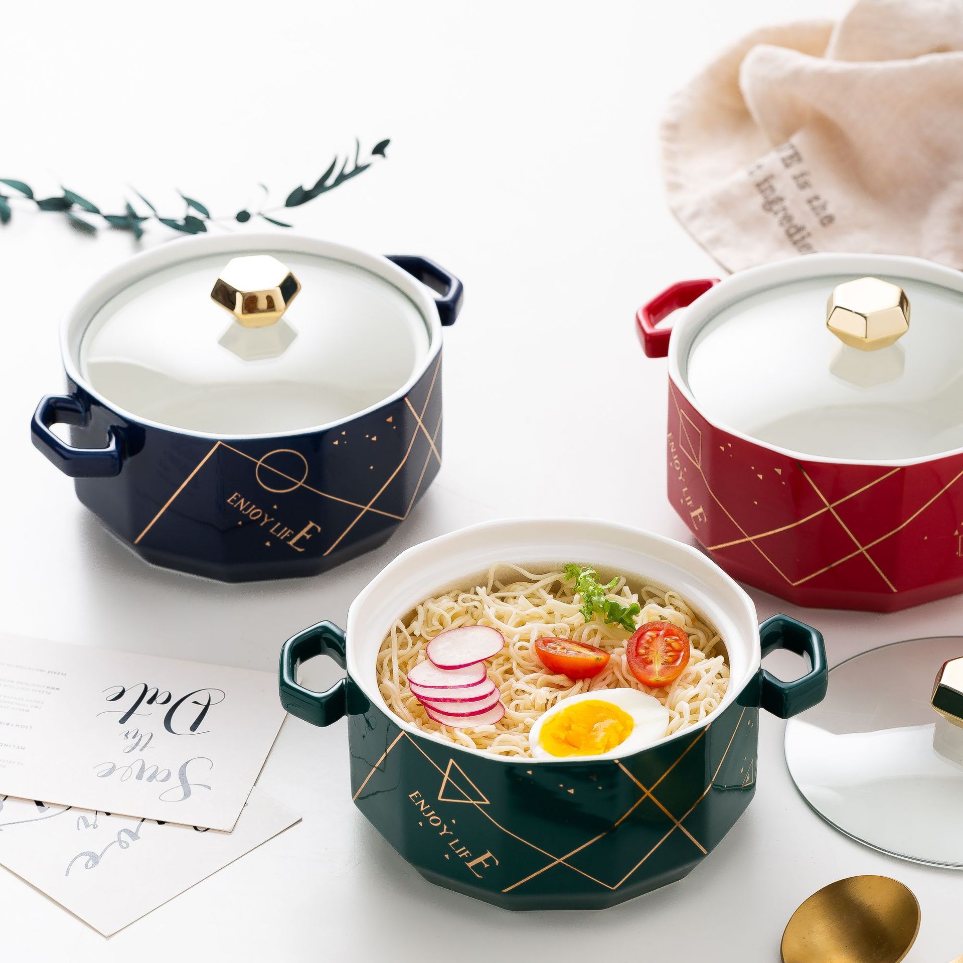 北欧创意陶瓷泡面碗带盖 家用保鲜碗 双耳汤碗可爱餐具微波炉瓷碗