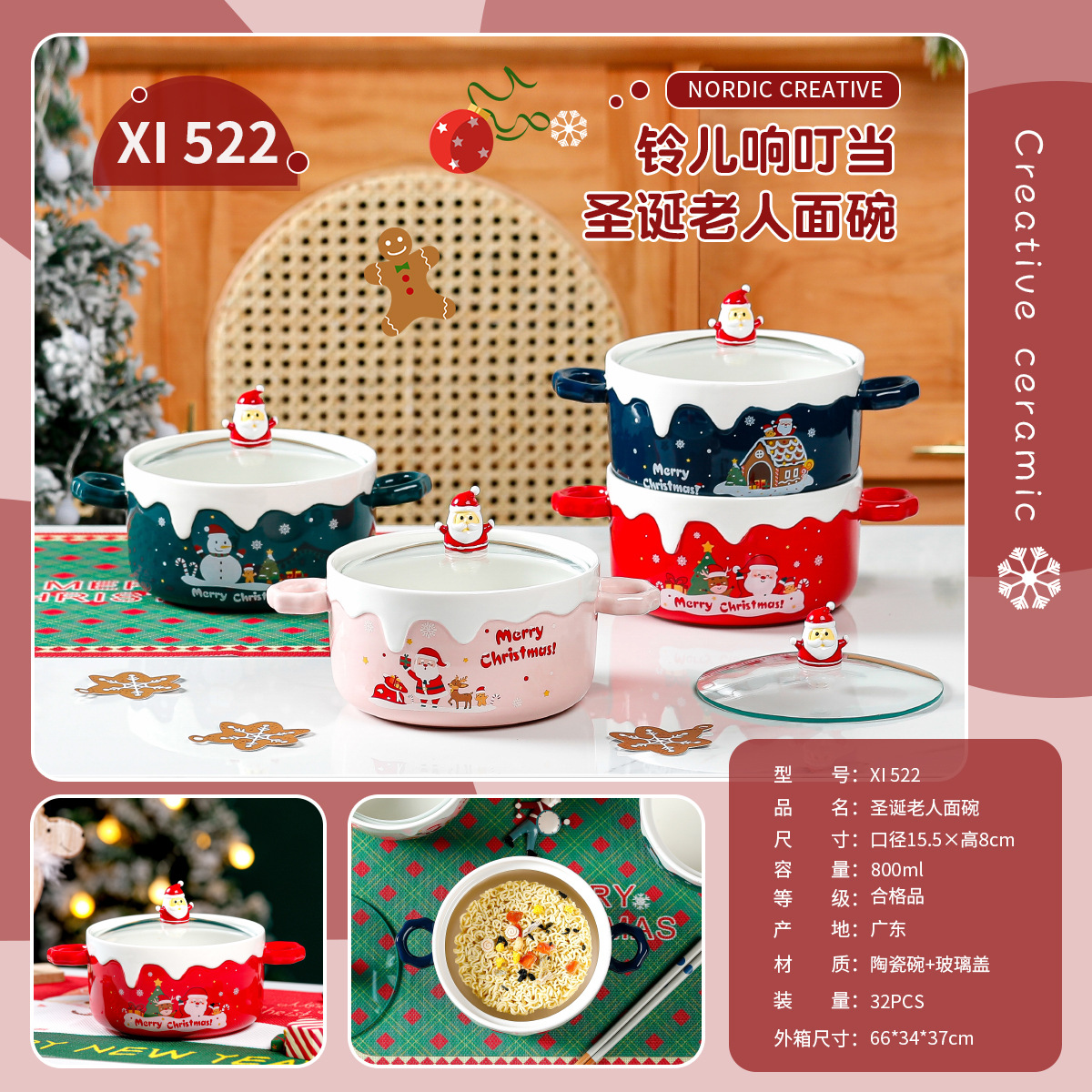 兔年双耳陶瓷面碗家用大容量泡面碗电镀金银边汤碗钢化透明玻璃盖