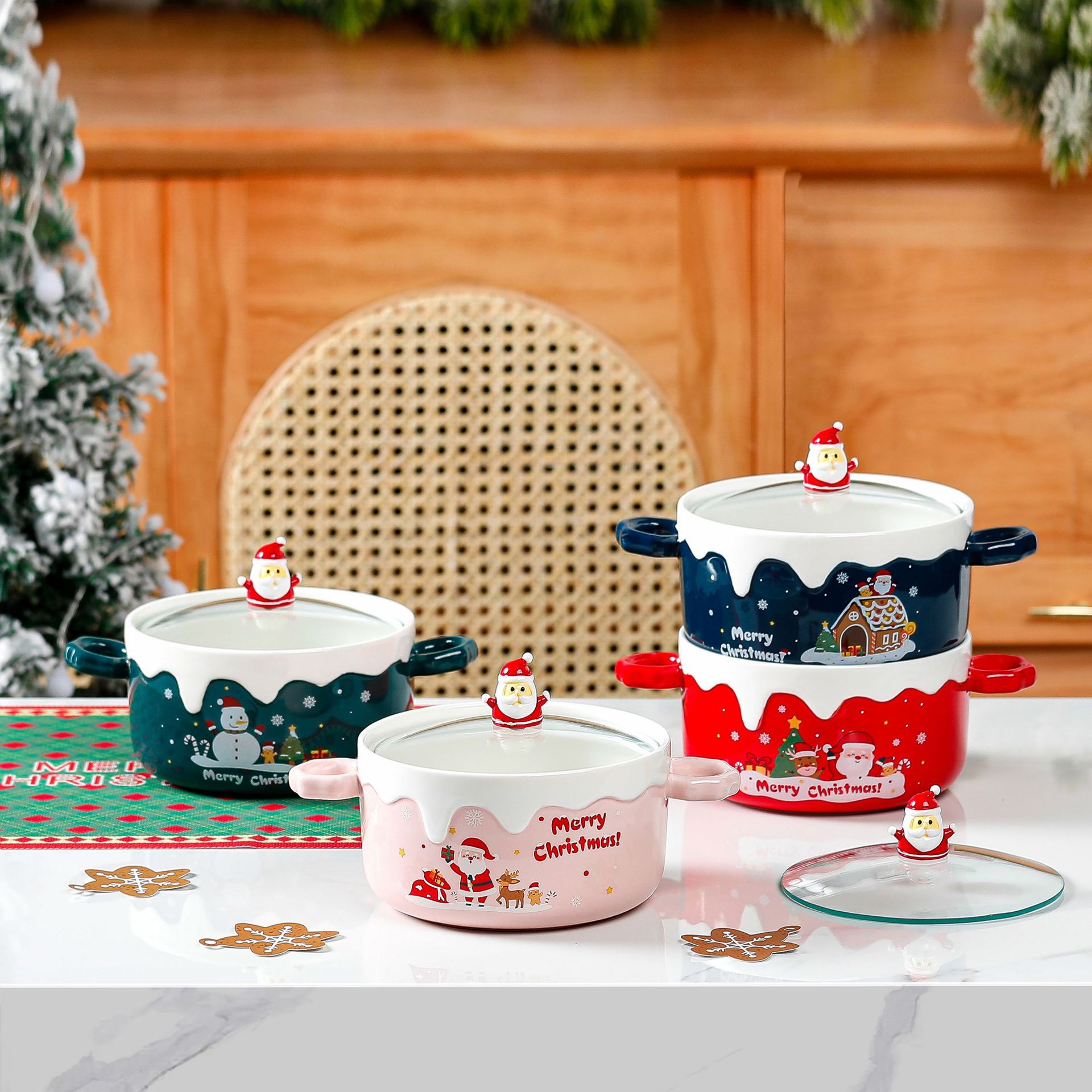 ins创意圣诞面碗个性浮雕麋鹿沙拉双耳碗钢化玻璃盖圣诞节礼物
