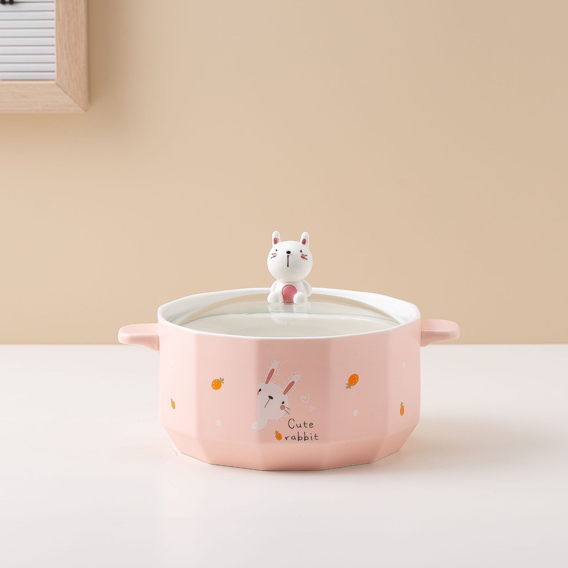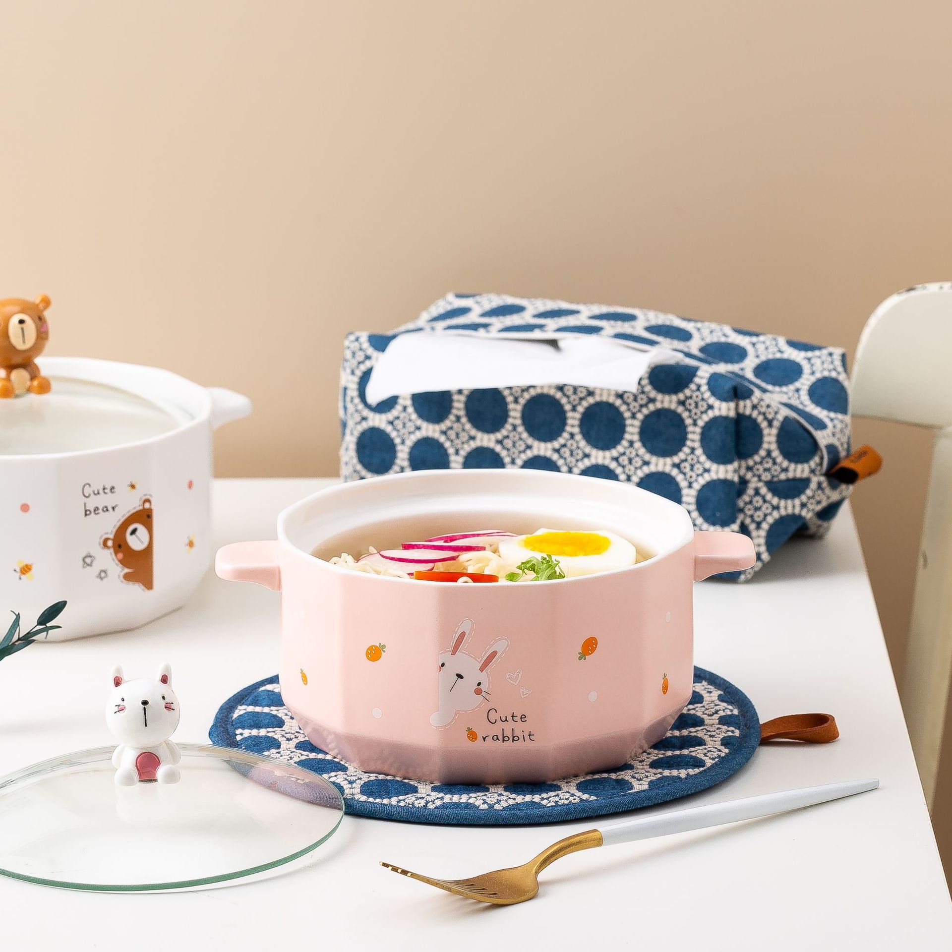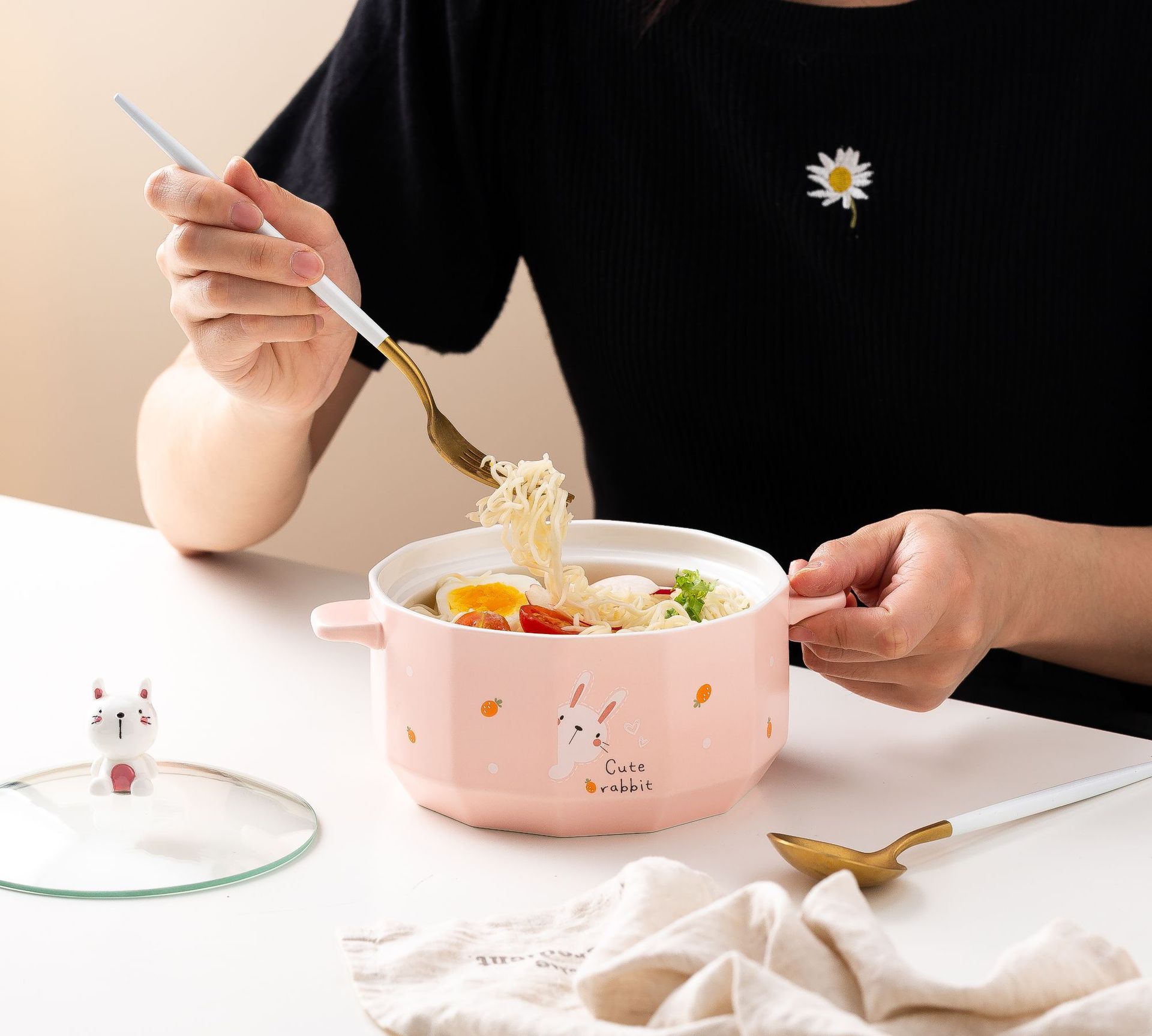 兔年双耳陶瓷面碗家用大容量泡面碗电镀金银边汤碗钢化透明玻璃盖