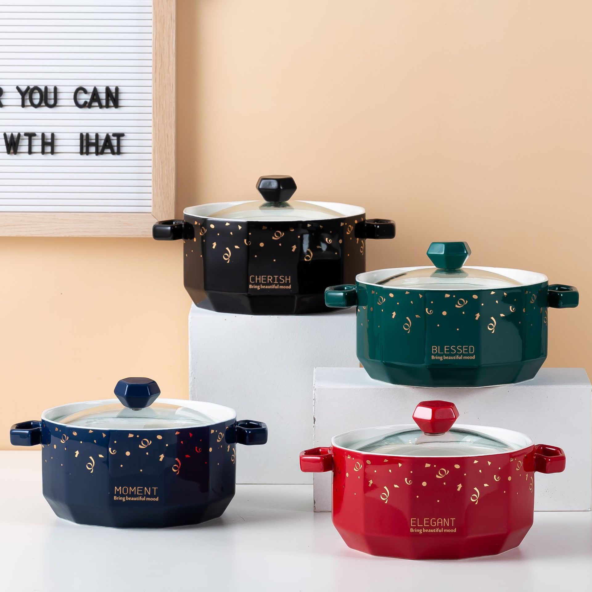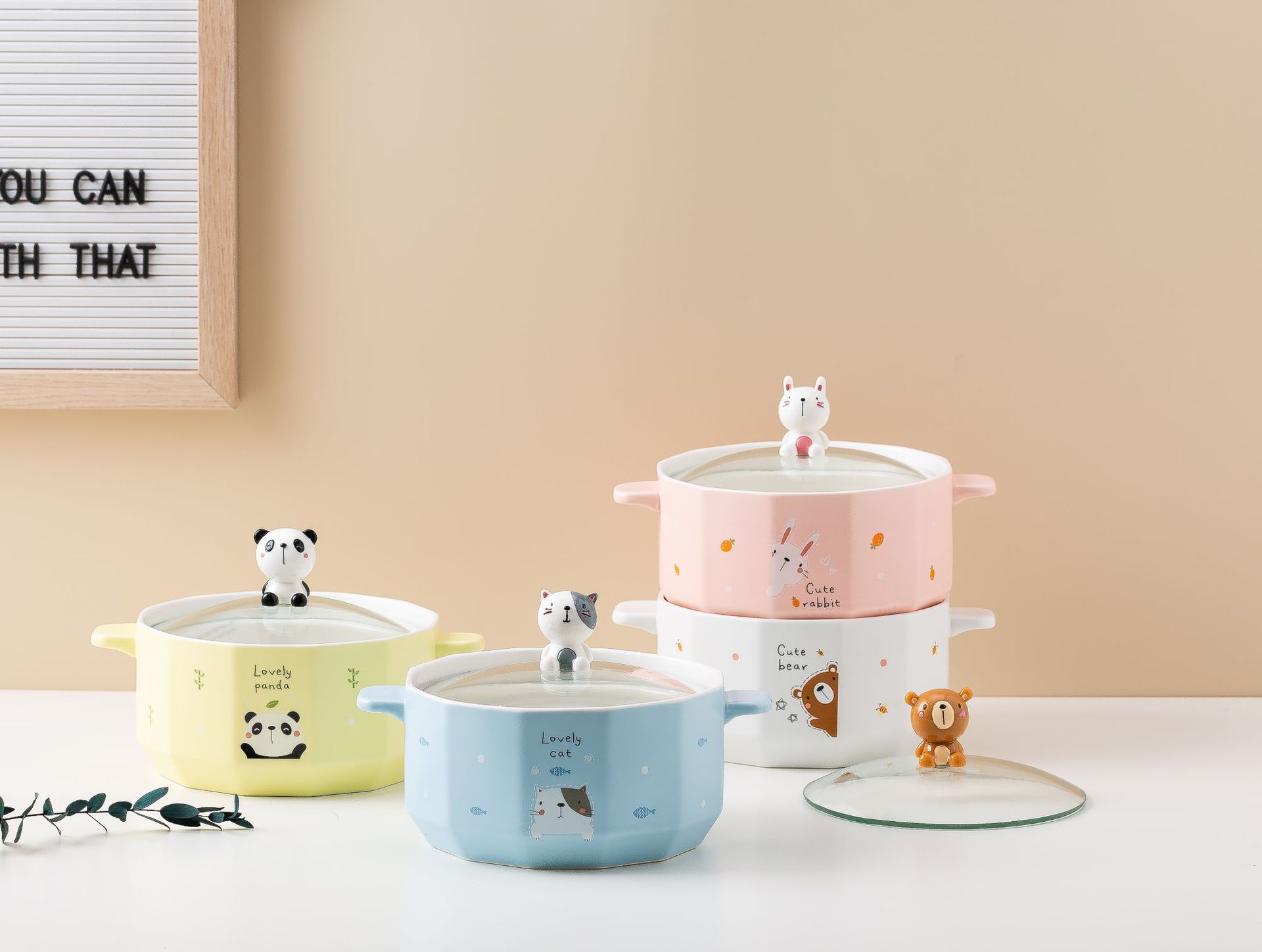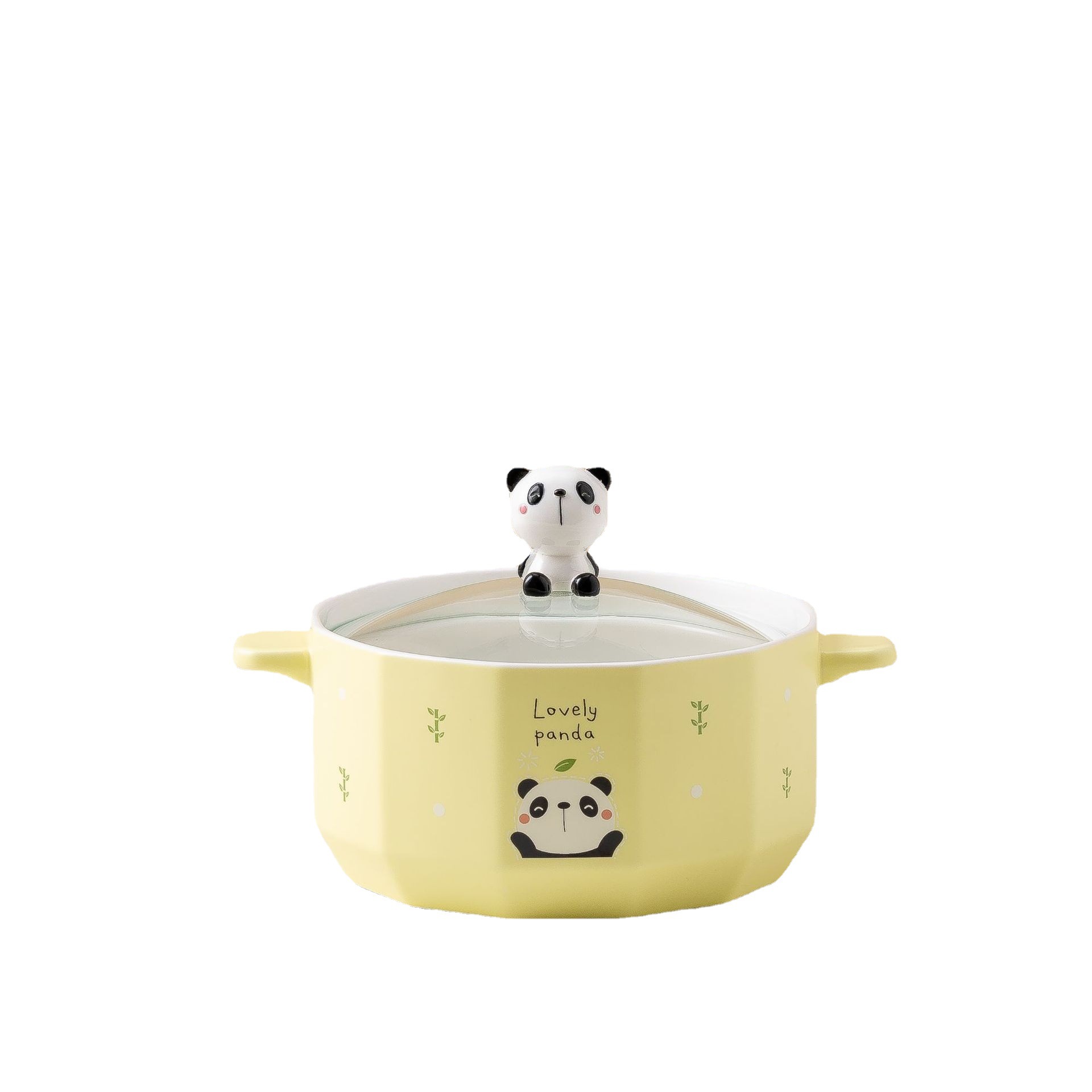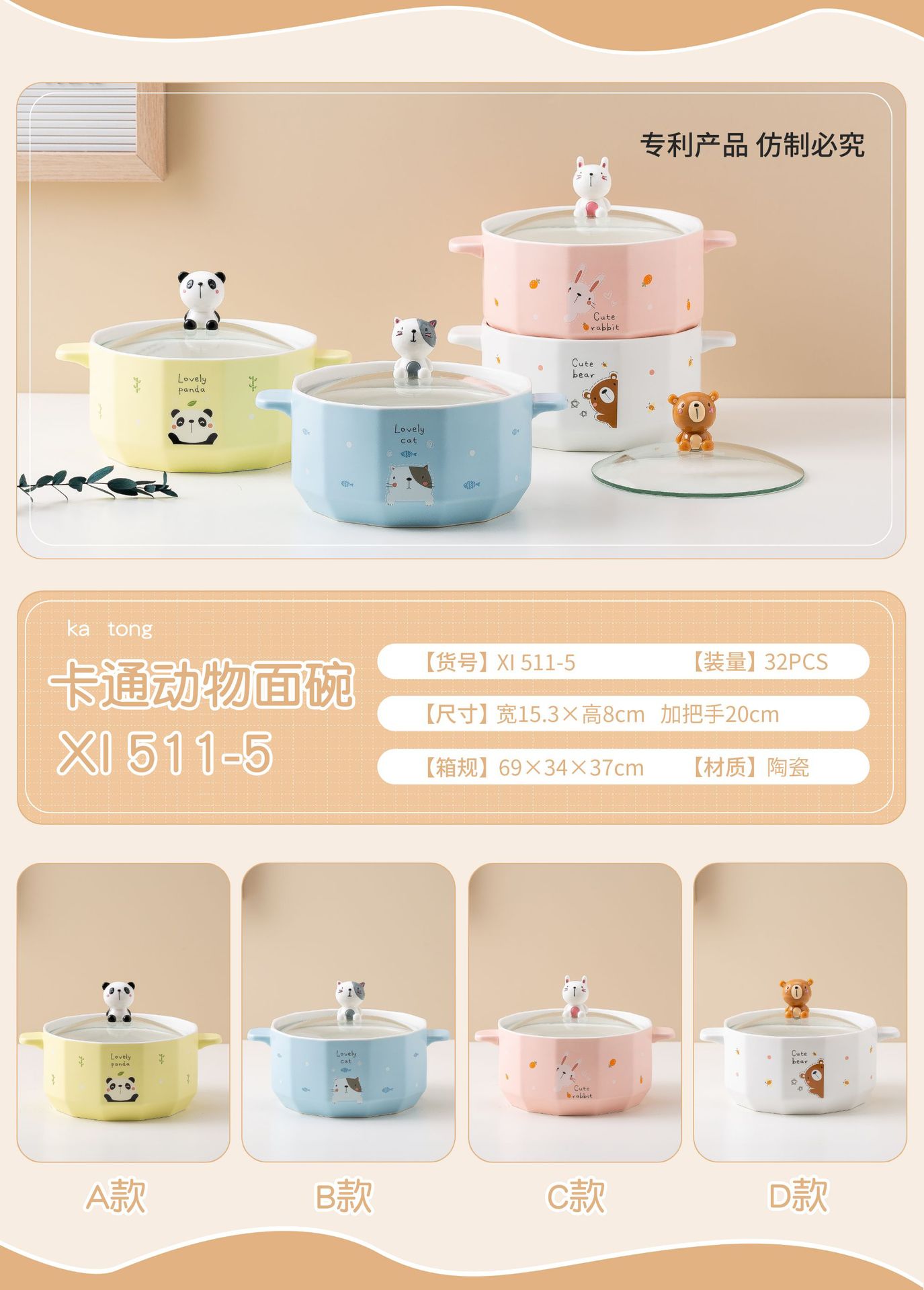兔年双耳陶瓷面碗家用大容量泡面碗电镀金银边汤碗钢化透明玻璃盖