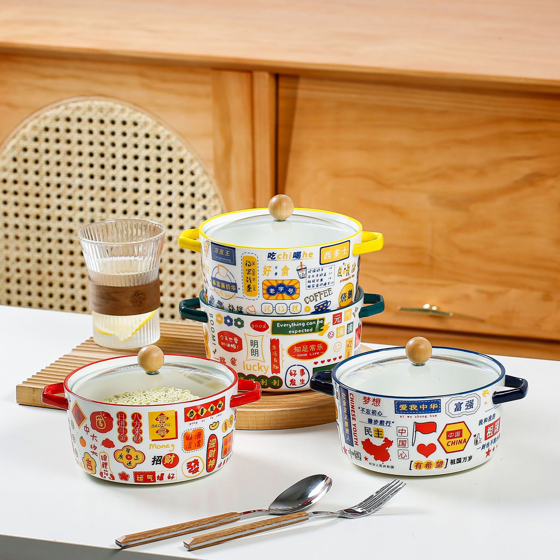 港风国潮元素复古陶瓷面碗双耳设计防烫伤钢化玻璃盖子家用泡面碗