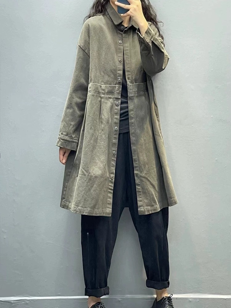 2023秋季新款文艺气质纯色中长款外套 宽松大版拼接翻领风衣女